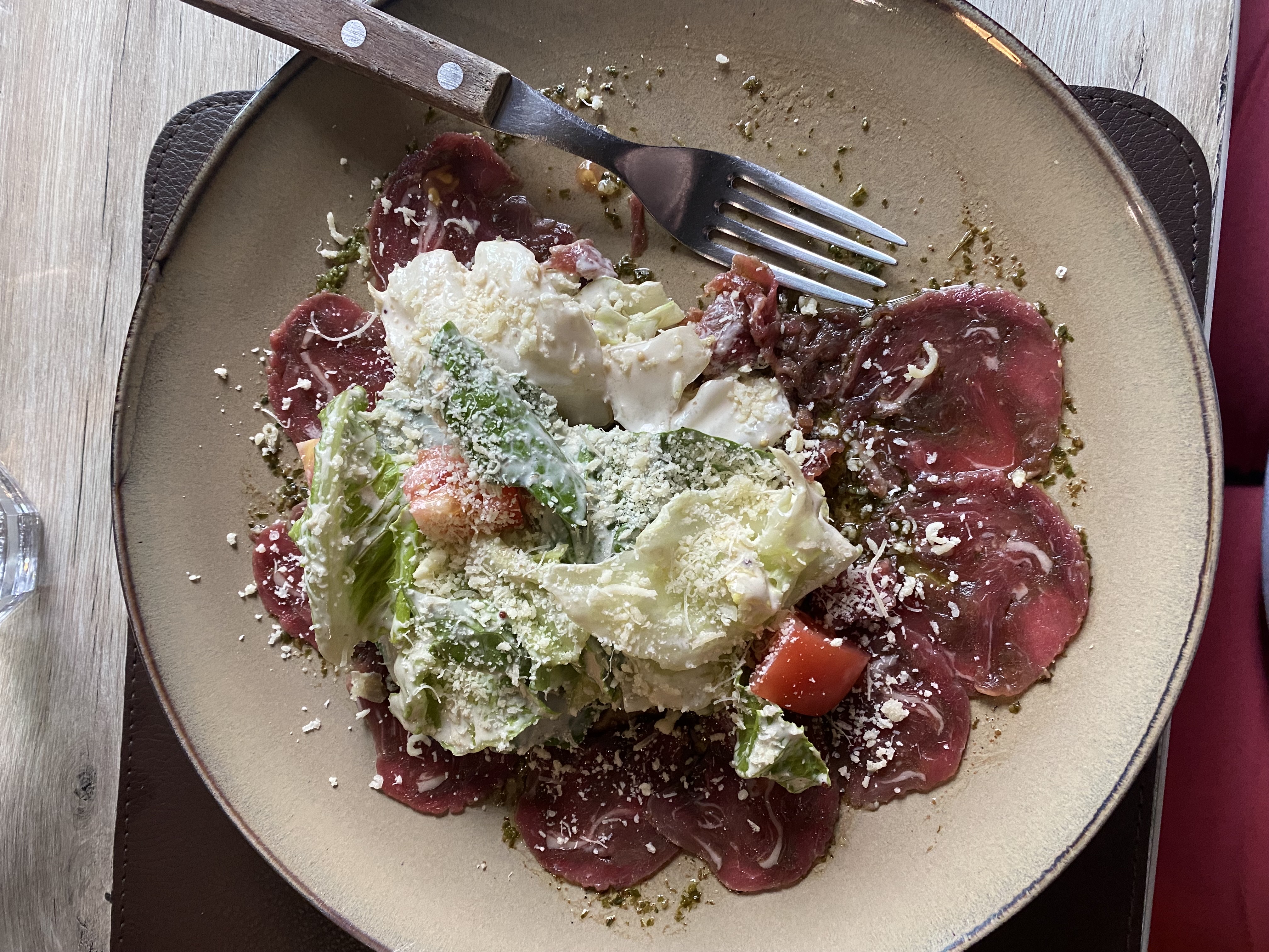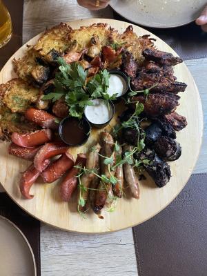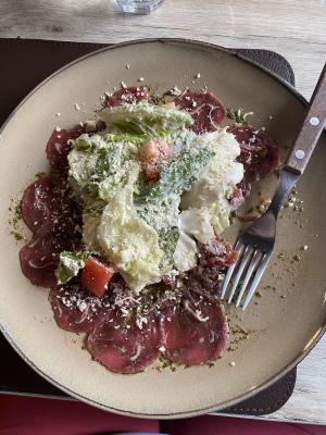 - Тар тар из говядины с копченым соусом, пармезаном и тартильей: тар тар (говядина, каперсы, лук, огурец маринованный, перец халапеньо) из говядины, соус копченый из шпрот, сыр пармезан, тартилья