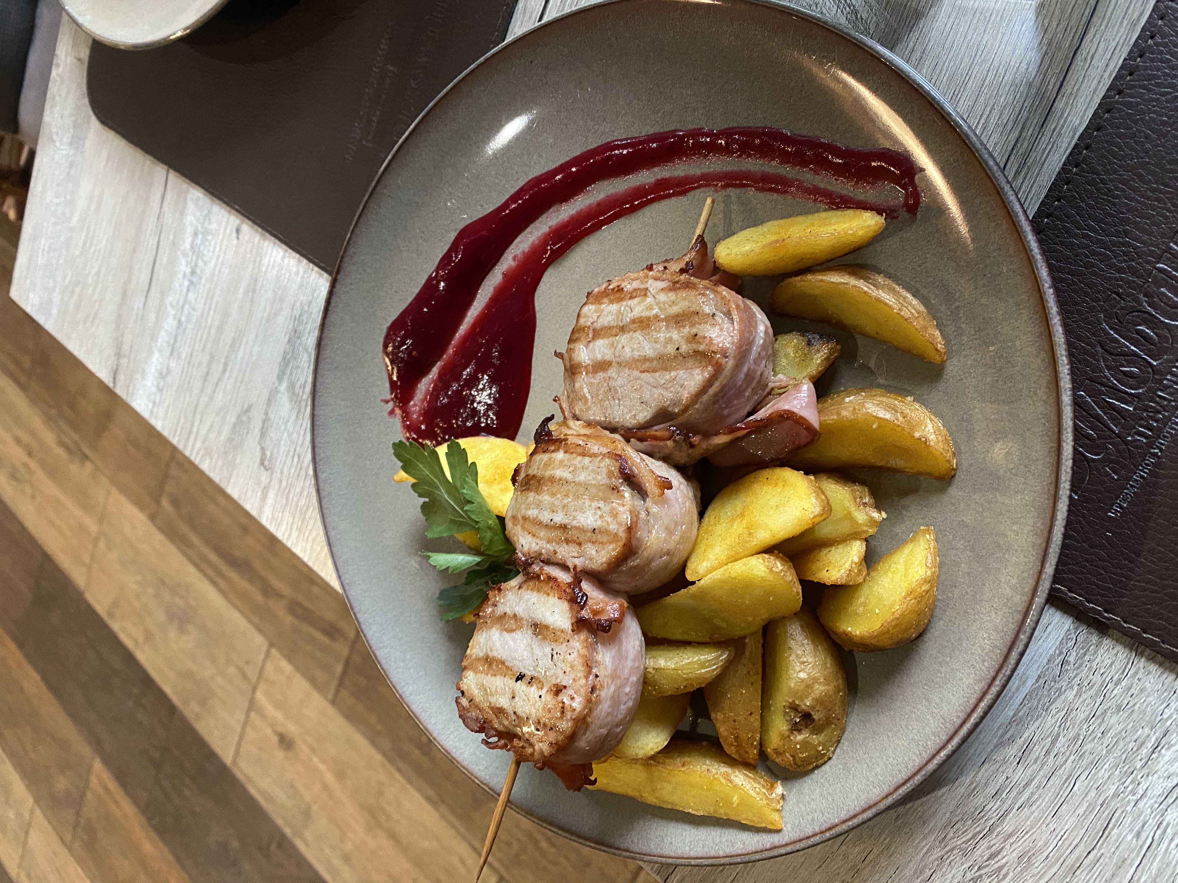 - Свиная копченая колбаска в беконе с соусом томатным карри и чесночным картофелем: колбаса свиная в/к, бекон в/к, кетчуп, сухой карри, картофель, чеснок сухой и чеснок свежий