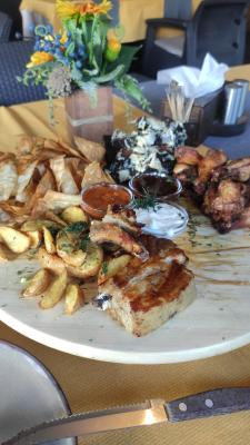 - Салат Цезарь с тигровыми креветками: тигровые креветки, салат микс, соус цезарь, томаты черри, сухарики, сыр пармезан, маслины