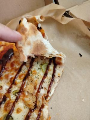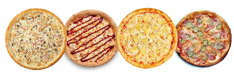 - пицца "Курица с ананасом" (32 см, 630 г): тонкое тесто, куриное филе, ананас, огурец маринованный, пицца соус, сыр моцарелла