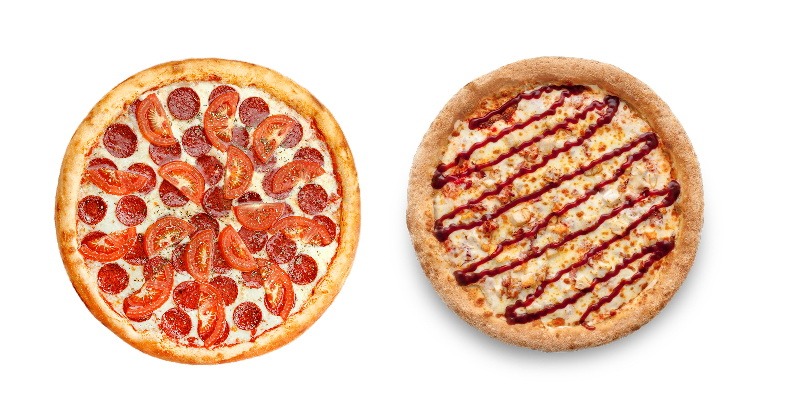 - пицца "Цыпленок барбекю" (32 см, 660 г): тонкое тесто, куриное филе, сыр моцарелла, пицца соус, огурец маринованный, лук, соус барбекю