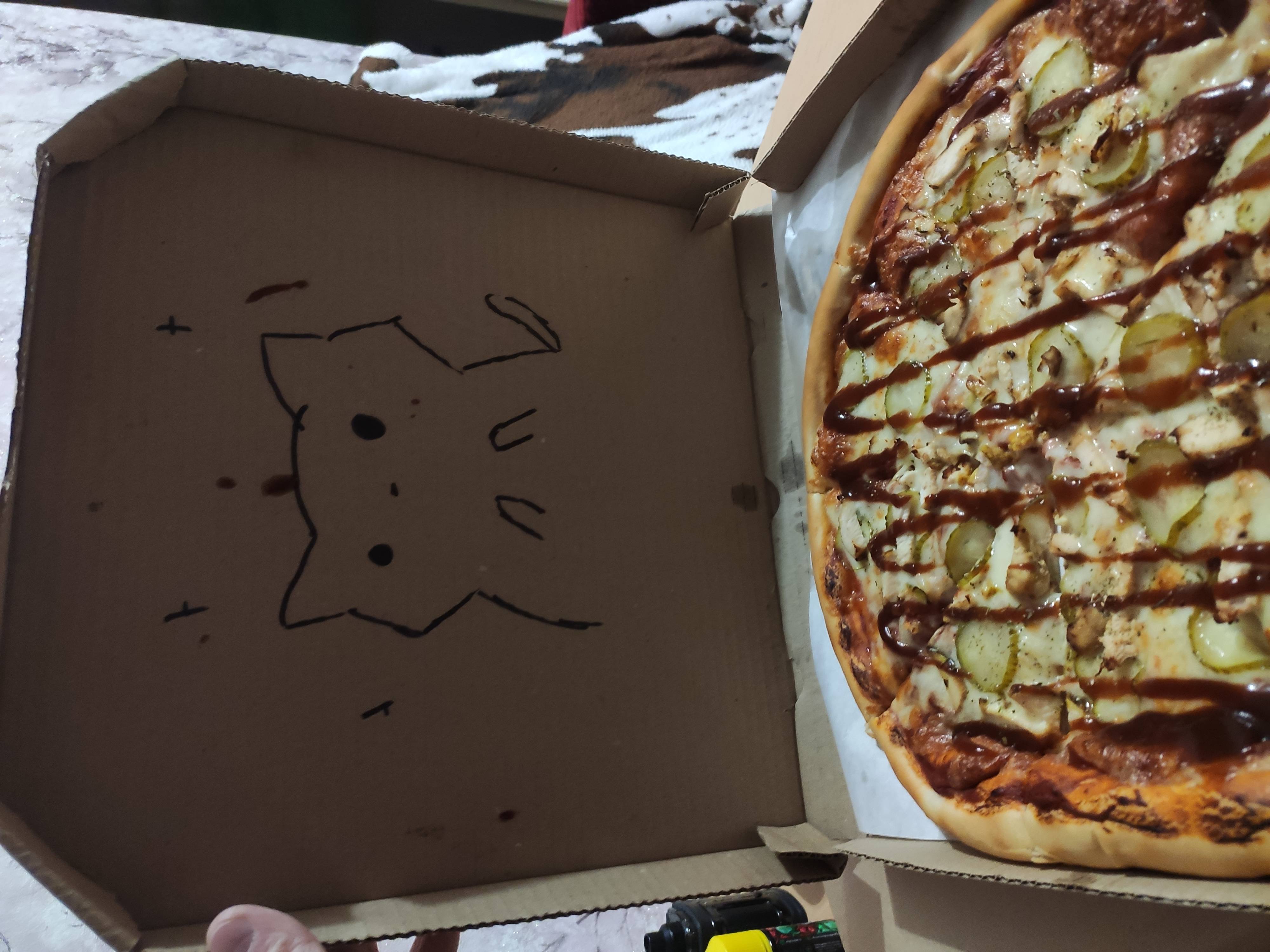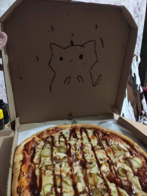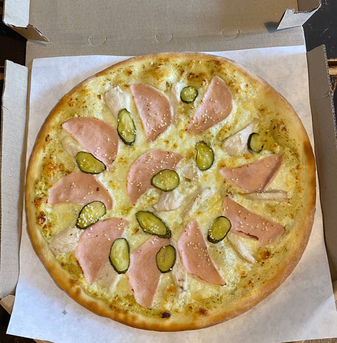 - пицца "Фантазия" (32 см, 600 г): тонкое тесто, ветчина, куриное филе, огурец маринованный, пицца соус, кунжут