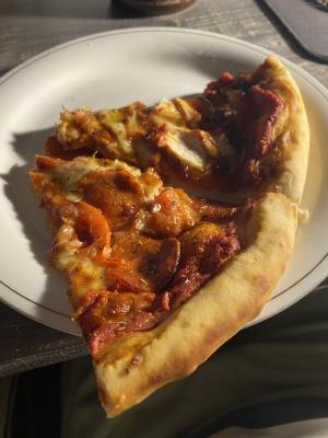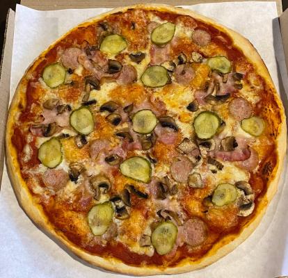 - пицца "Трио" (32 см,570 г): тонкое тесто, пепперони, ветчина, сыр моцарелла, пицца соус, огурец маринованный, грибы шампиньоны