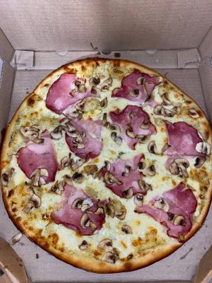 - пицца "Карбонара" (32 см, 620 г): ): тонкое тесто, грибы шампиньоны, грудинка, белый пицца соус, сыр моцарелла