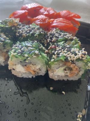 - ролл "Грин сальмон" (водоросли Чука маринованные, рис, нори, лосось, сыр мягкий "Кремчиз", кунжут-микс) - 8 шт.