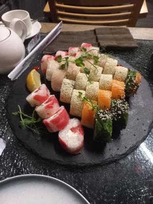 Сет " Барселона". Суши хорошие, ровные, свежие. Только слишком много огурца в двух видах)) Перебивал вкус рыбы. Обслуживание отличное, быстро и вежливо. Место приятное.