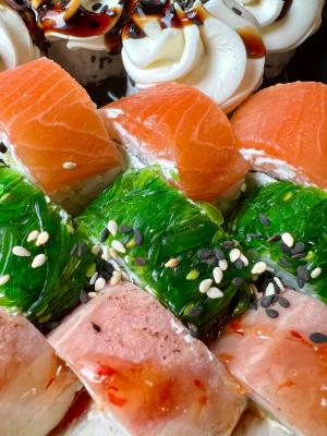 - ролл "Грин сальмон" (водоросли Чука маринованные, рис, нори, лосось, сыр мягкий "Кремчиз", кунжут-микс) - 8 шт.