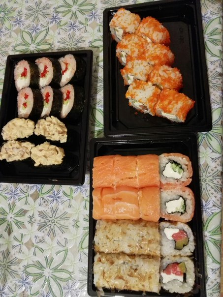 В этот раз брали сет Четыре вкуса. Все отлично - и доставка, и свежесть продуктов и вкус. Вдвоем все не смогли осилить!