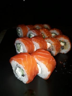 - Запеченный с лососем-210 гр(рис, нори, лосось, огурец, авокадо, сыр филадельфия, тобико, майонез, терияки, салат)