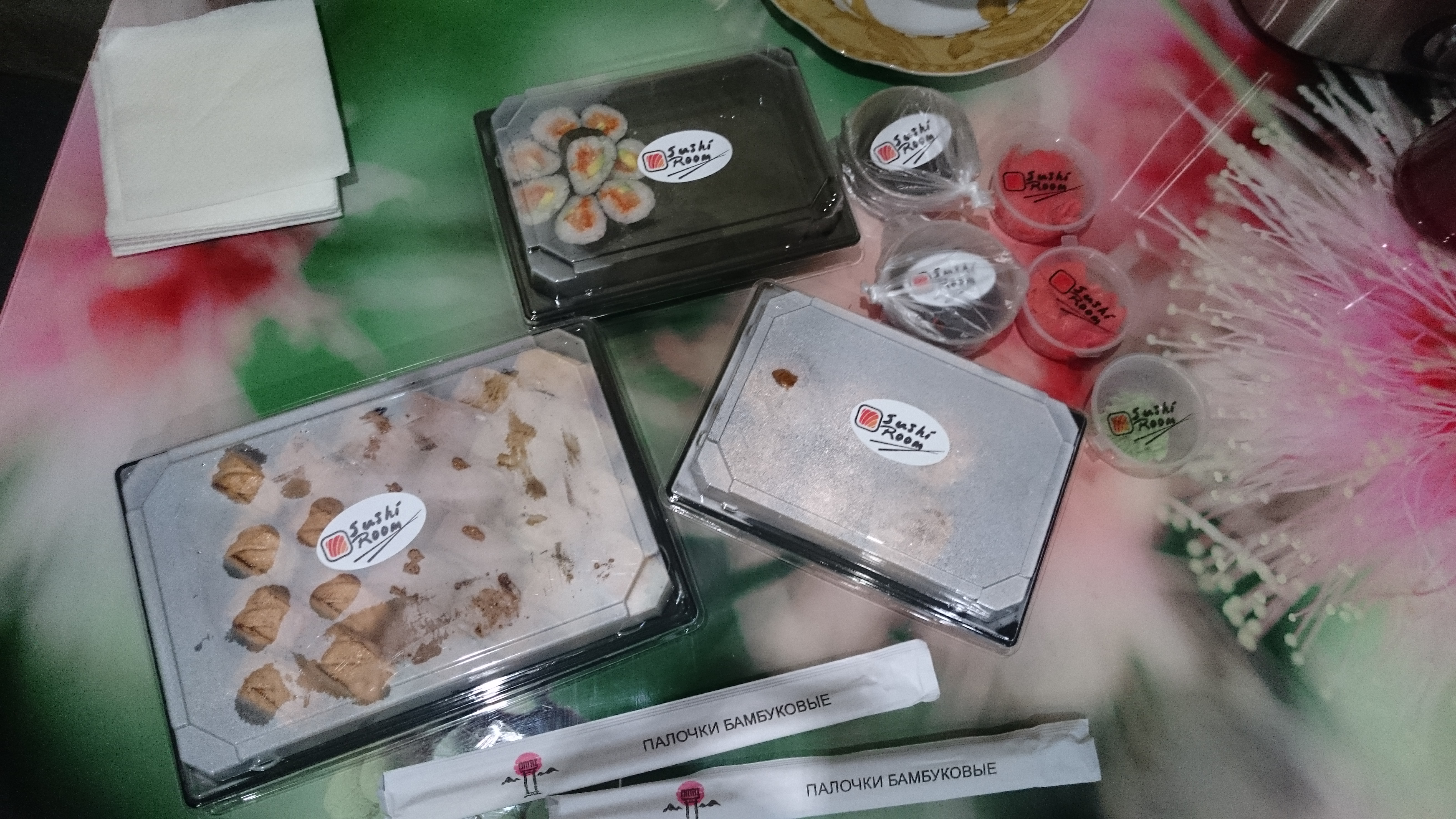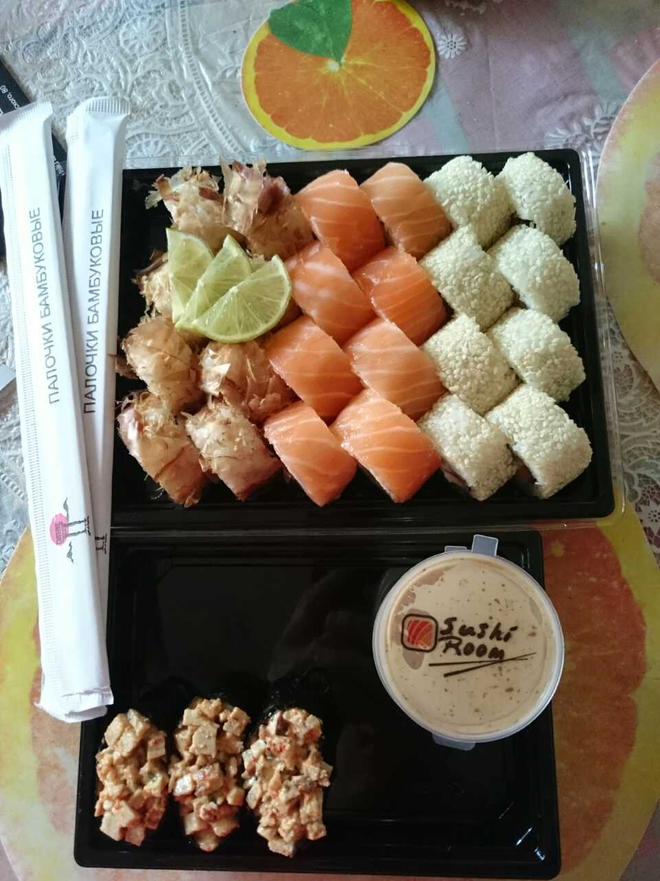 Первый раз заказывала в Sushi Room, осталась очень довольна. Доставка за 90 минут.Суши вкусные и аккуратные)) Все упаковано красиво. Можно оплатить картой, +1)