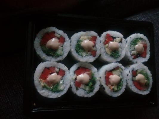- Ролл с запеченным перцем (рис, нори, майонез, перец запеченный, авокадо, огурец).