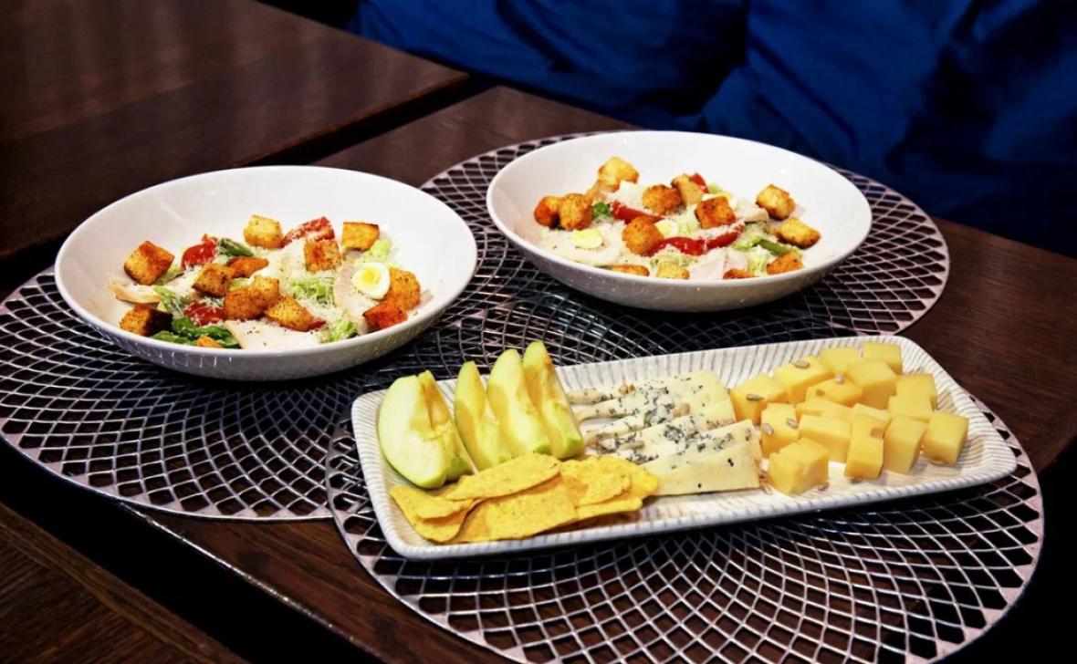 - "Цезарь с курицей" (440 г/2 порции): копченая куриная грудка, яйцо перепелиное, сыр пармезан, гренки бриошь, соус цезарь, салат рамен, черри