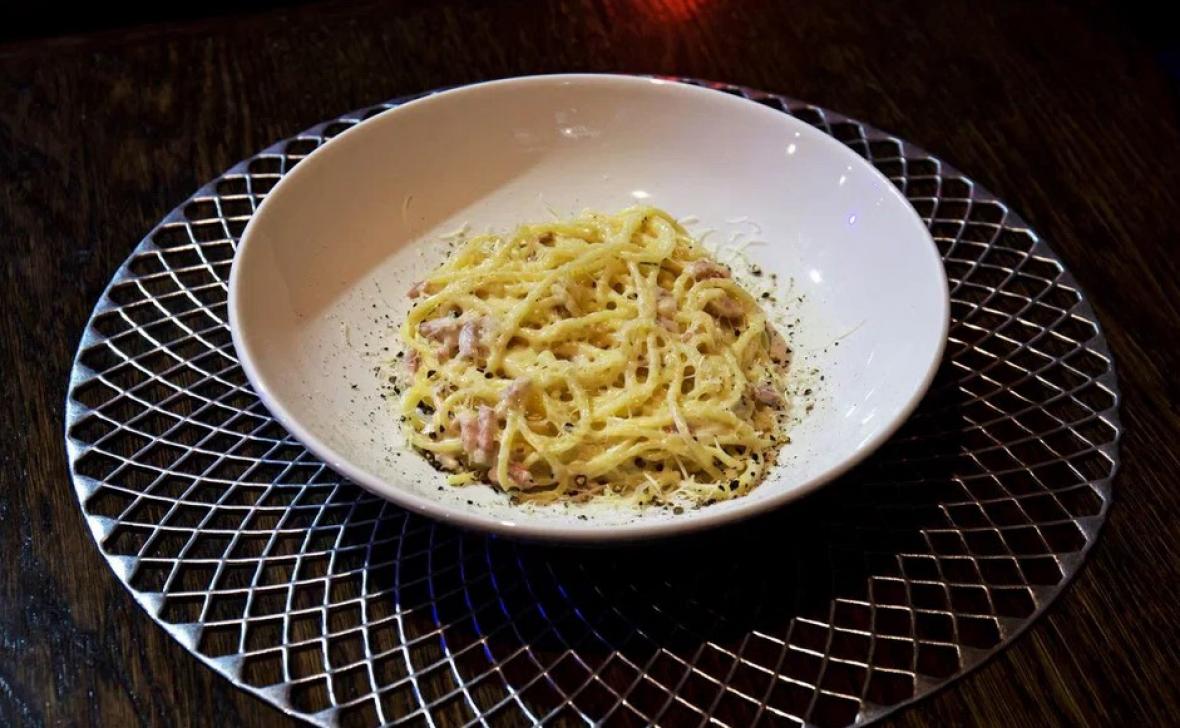 Состав: спагетти, грудинка копченая, яйцо желток, бульон, сыр пармезан