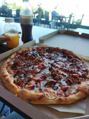 Состав: тесто, томатная паста, майонез, сыр моцарелла, курица, шампиньоны, болгарский перец, помидоры черри
