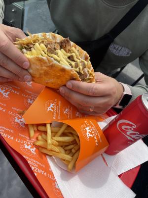 Состав панзаротти антрекот (270 г): тесто, томатная паста, сыр моцарелла, оливки, лист салата, картофель фри, маринованный огурец, болгарский перец, антрекот (говядина), соус на выбор
