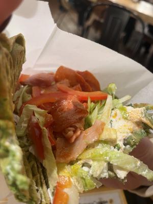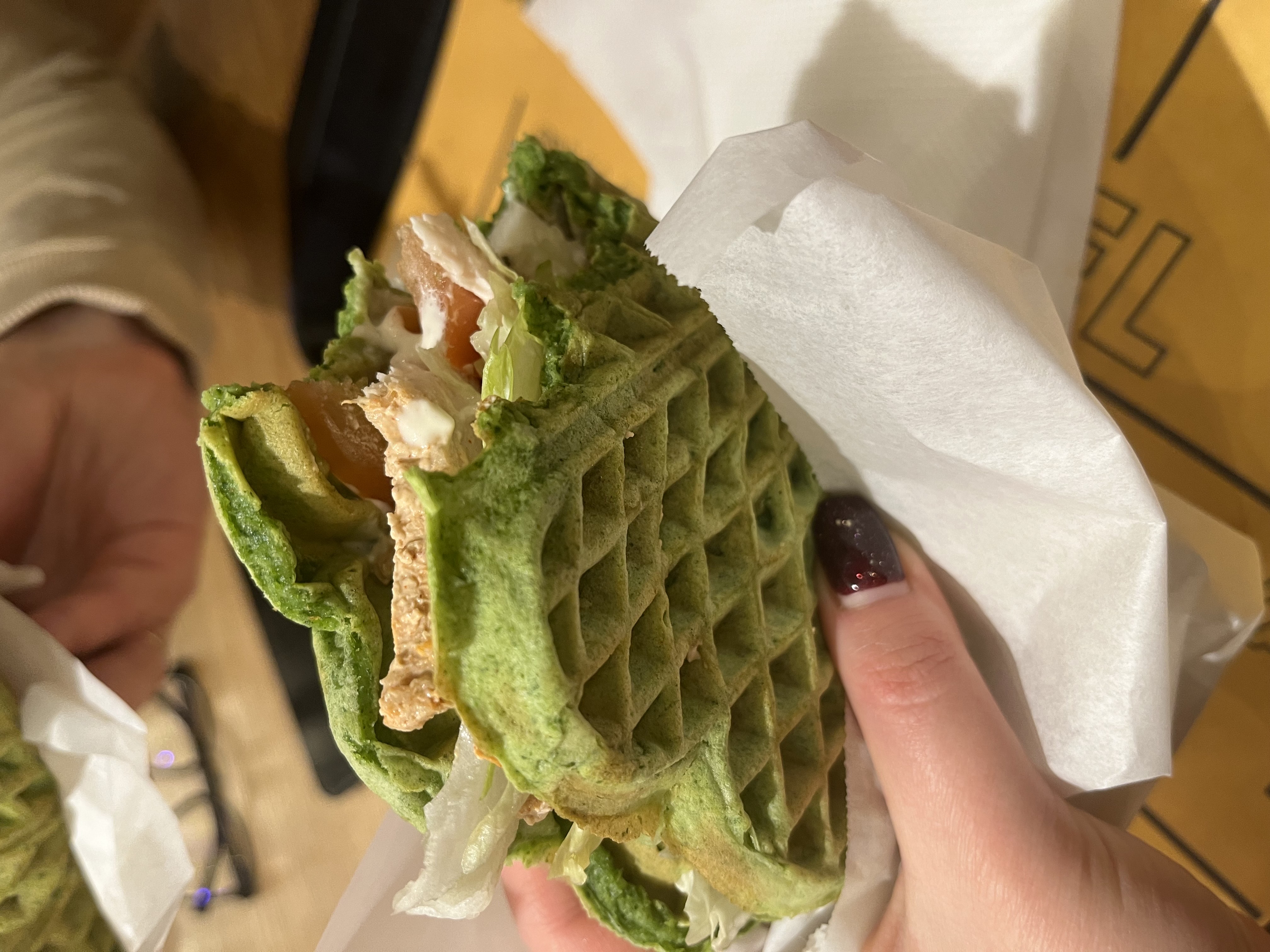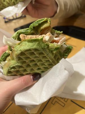Состав: аппетитная легкая вафля на шпинатном тесте с запеченным куриным филе, томатами, айсбергом и соусом цезарь