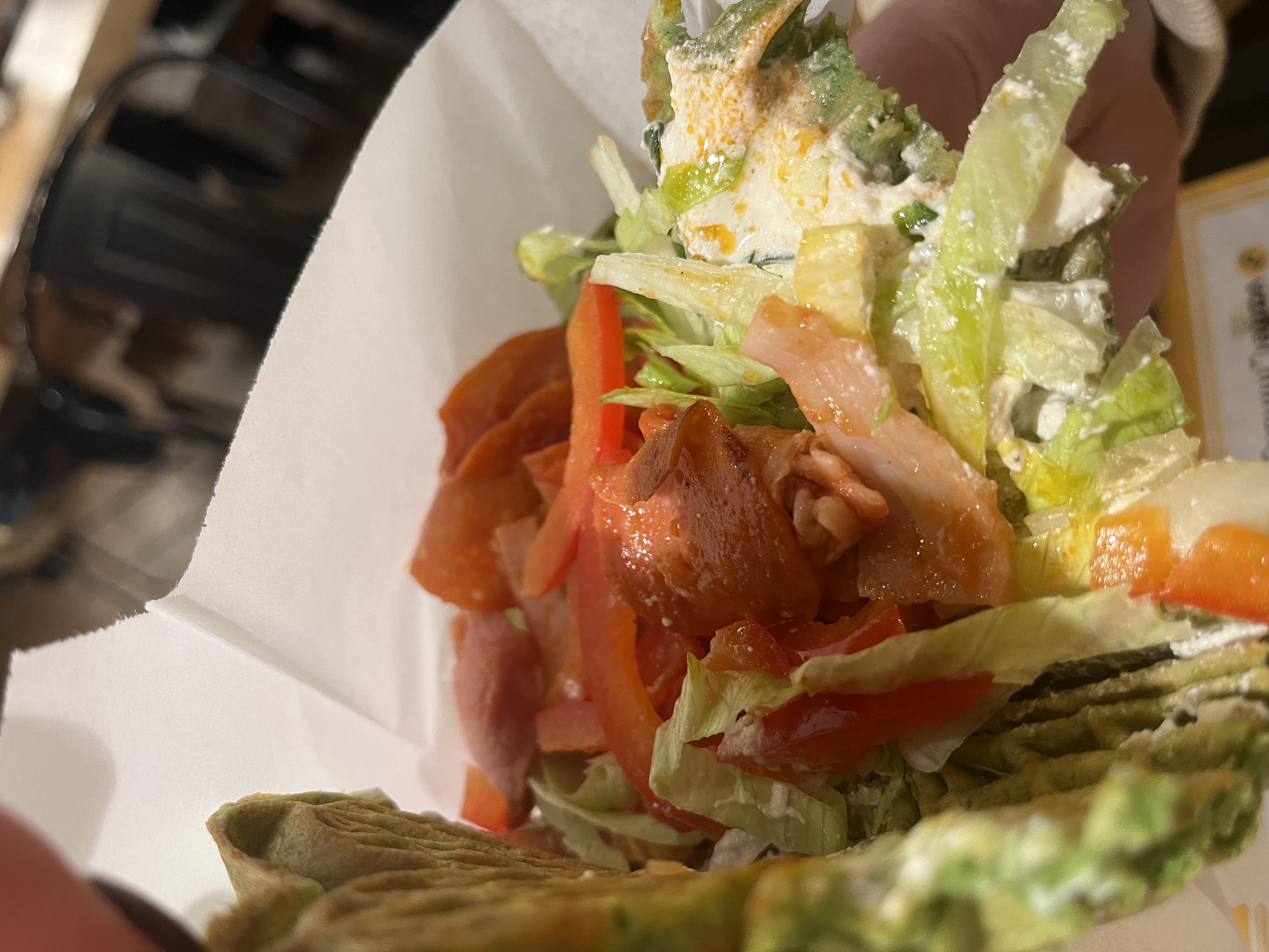 Состав: вафля на шпинатном тесте, томат, огурец, паприка, оливки, соус сладкая аджика, соус фета