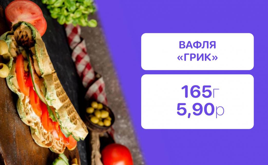 - "Грик" мини (150 г): вафля на шпинатном тесте, томат, огурец, паприка, оливки, соус сладкая аджика, соус фета