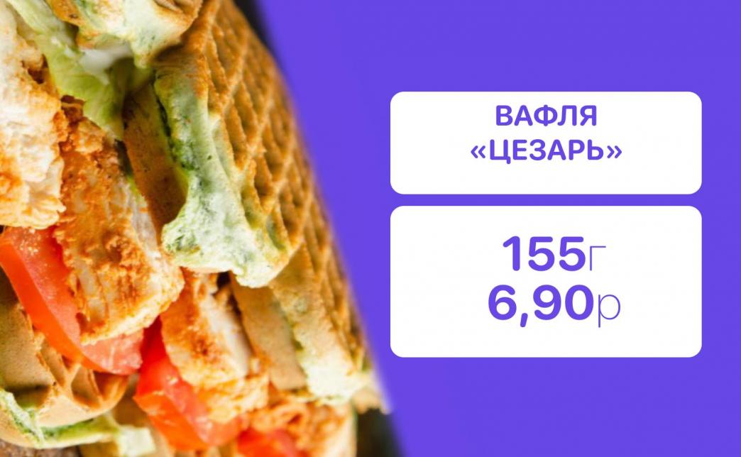- "Цезарь" мини (155 г): аппетитная легкая вафля на шпинатном тесте с замеченным куриным филе, томатами, айсбергом и соусом цезарь - 2 шт