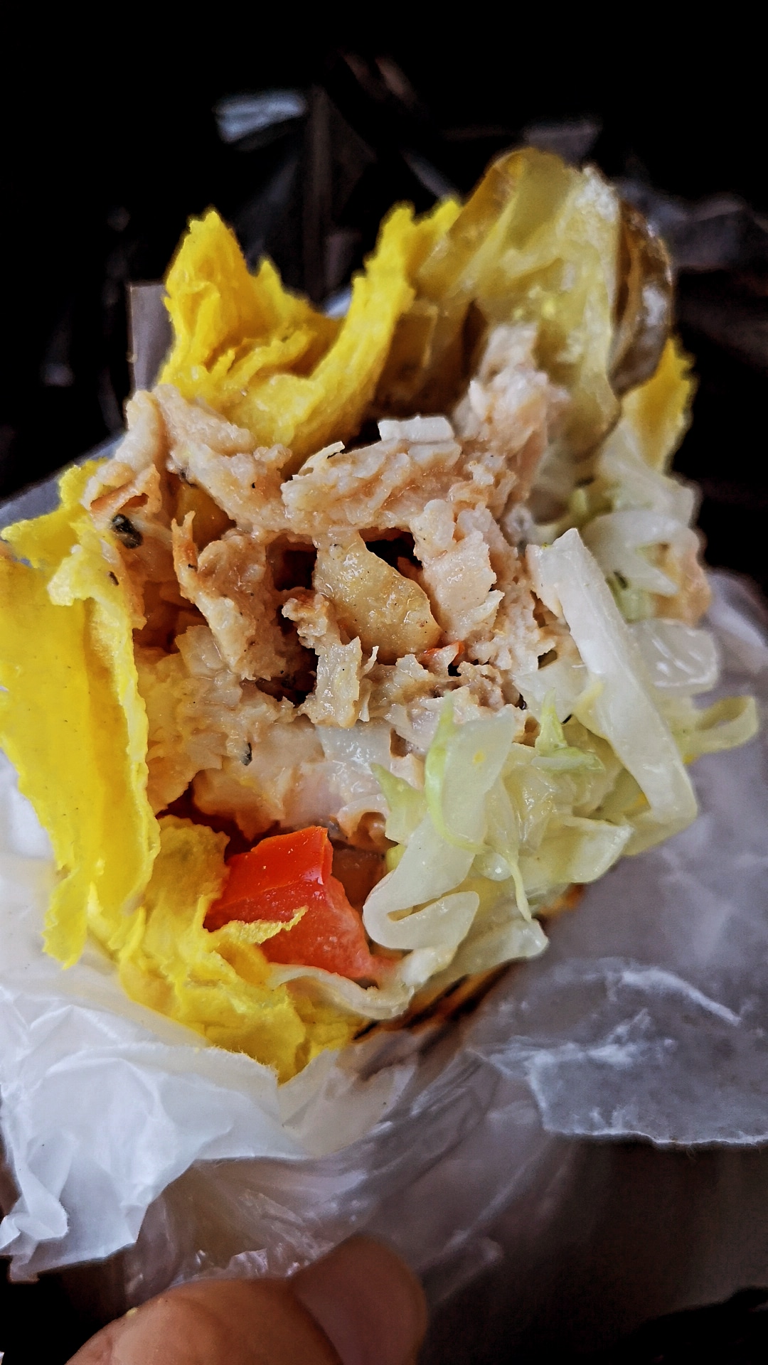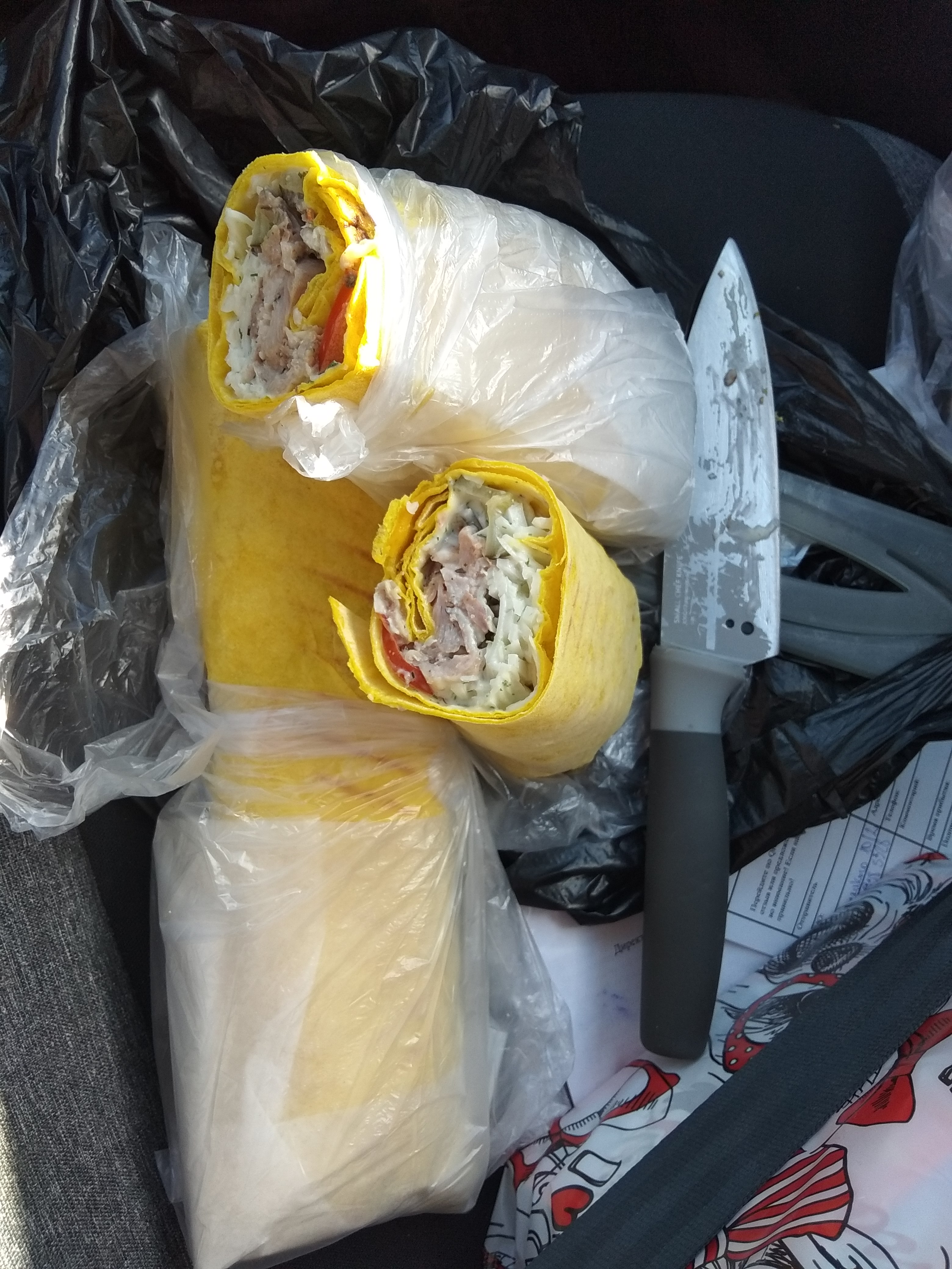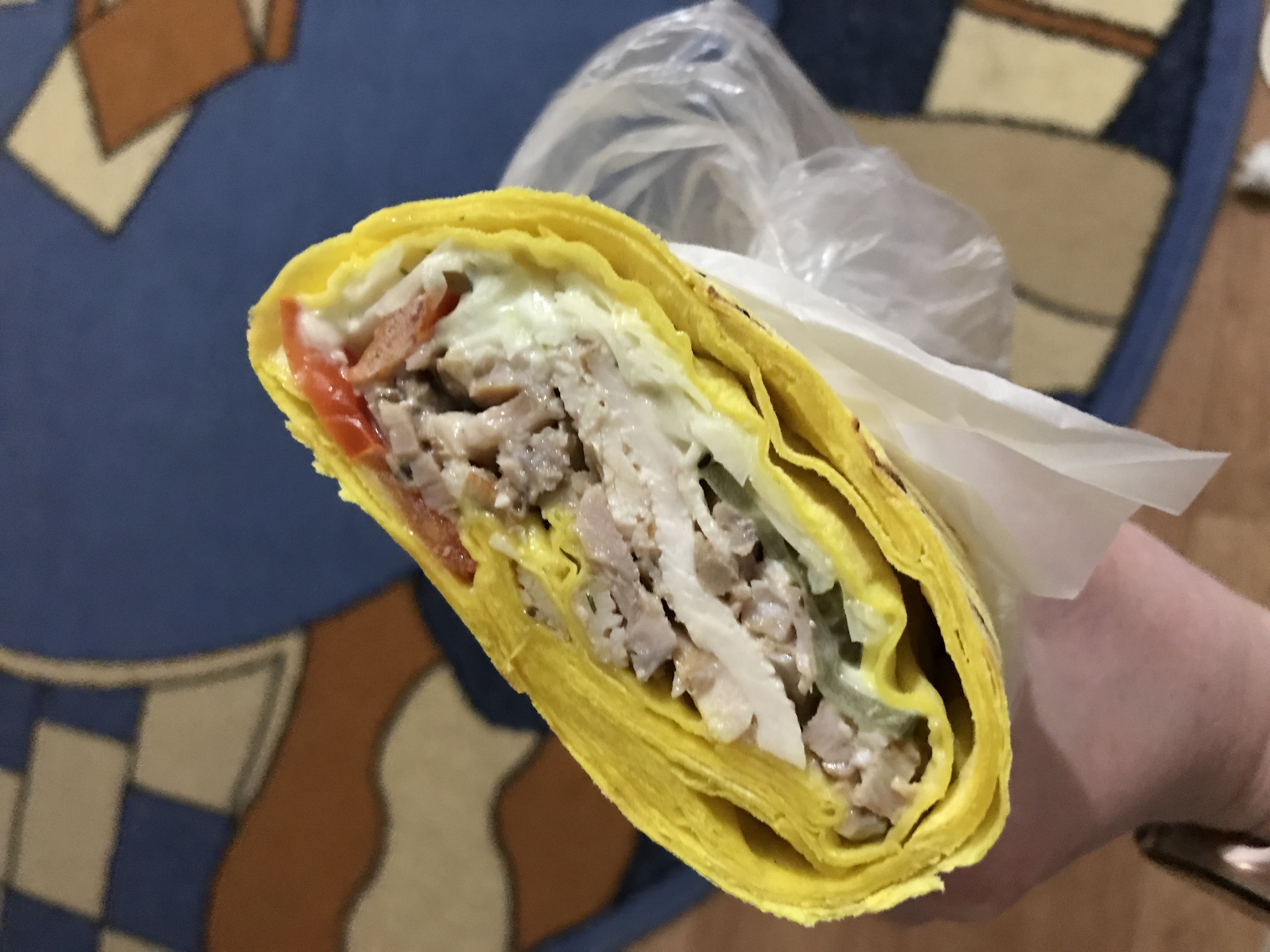- лаваш, курица гриль, соус чесночный, томат, огурец маринованный, капуста.