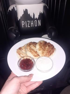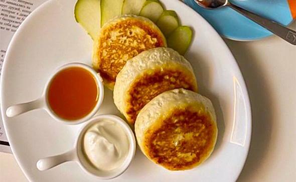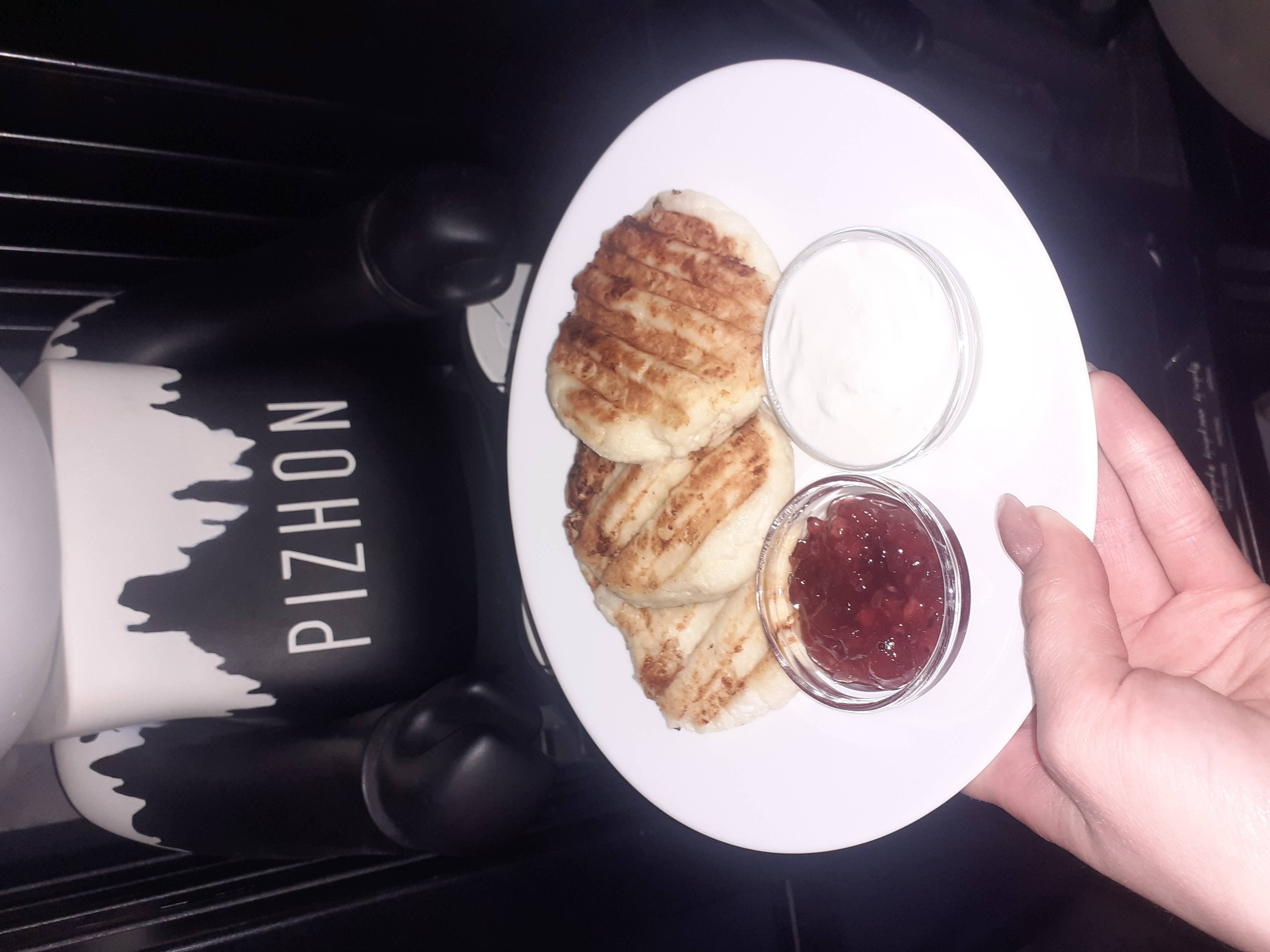 Состав: творог, яйцо, мука, сахар - сырники, к сырникам джем и сметана, кокосовая стружка по желанию