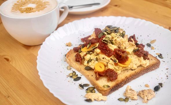 Состав: французский тост, яйца, творожный сыр, вяленые томаты, сыр чеддер, тыквенные семечки
