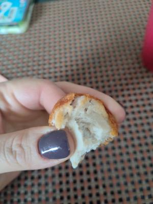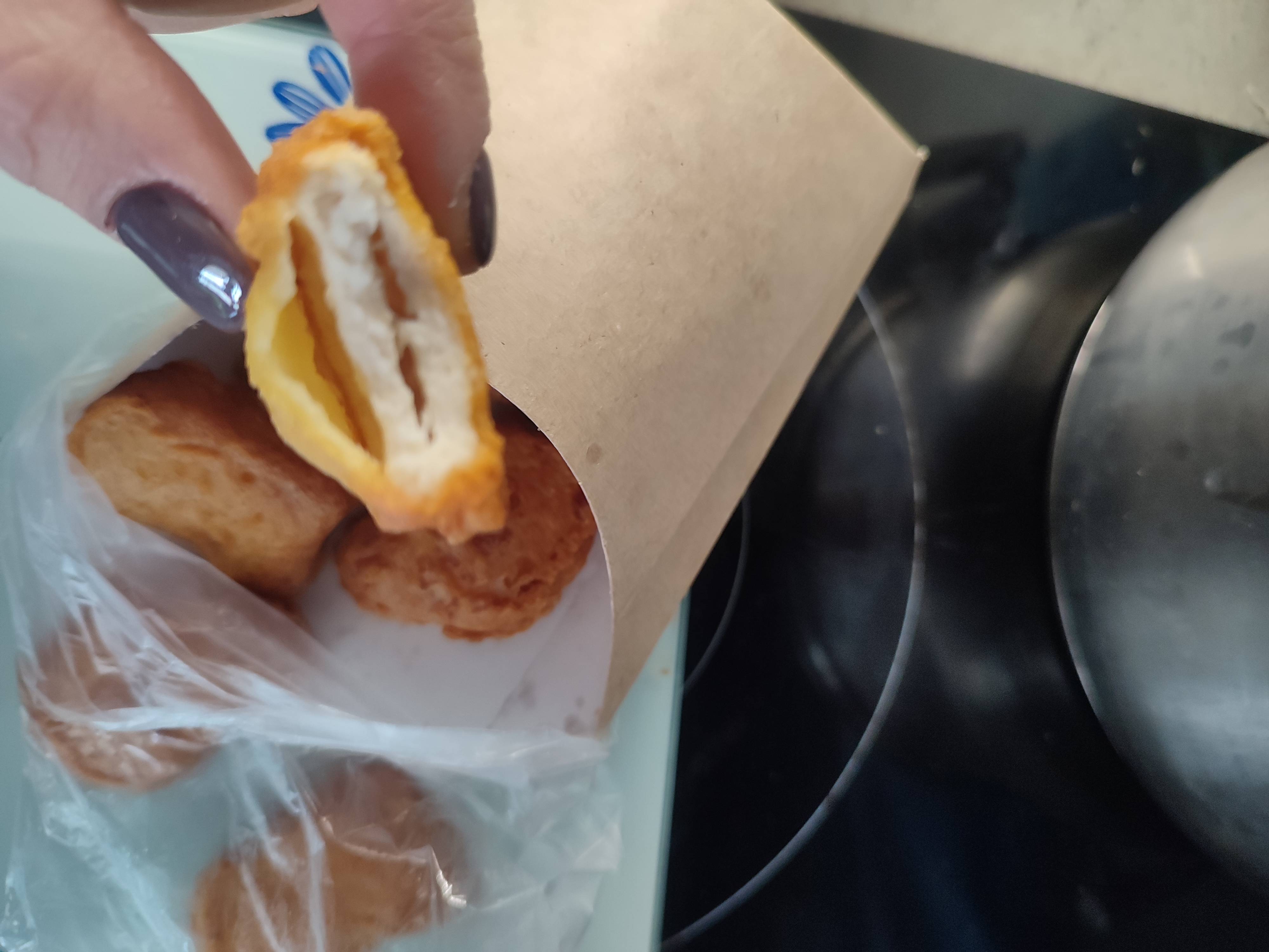 г вместо 200 обещанных.Это всё ерунда, пусть бы лучше было даже и меньше, но вкусно. Тут же вообще непонятно что за мясо..явно не курица, а как будто фарш запечный с большим количеством специй и цвет гораздо темнее, чем должен быть у курицы с вертела. Просто невкусно. Есть с чем сравнить. Нагетсы вообще непонятно из чего сделаны, сухие до жути, корочка надулась , а внутри полупустые и по текстуре совсем не похожи на куриные нагетсы. Все бы это ничего, можно было бы закрыть глаза, если бы не вечером (после такого обеда) начались проблемы с животом и на утро продолжились.. (в этот день не завтракали, а на ужин были только фрукты).