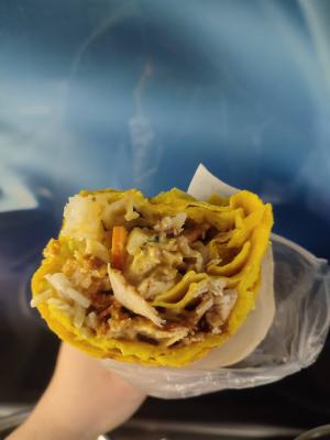 Состав: курица, лаваш армянский, капуста, помидор, огурец маринованный, морковь по-корейски, соус чесночный, соус красный