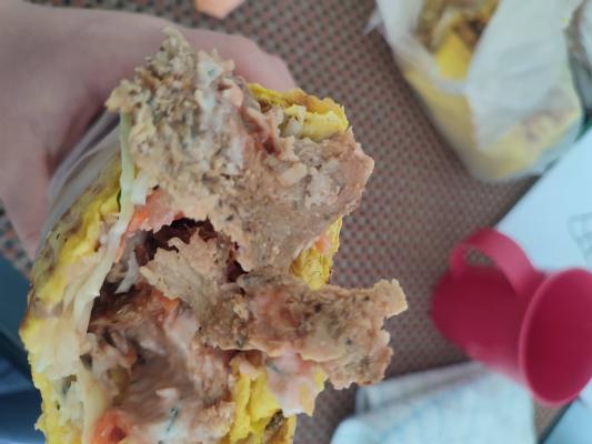 Шаурма была вкусная до тех пор, пока в самом конце не дошли до сюрприза в виде длинного белого волоса.... неприятненько🤮🤮🤮