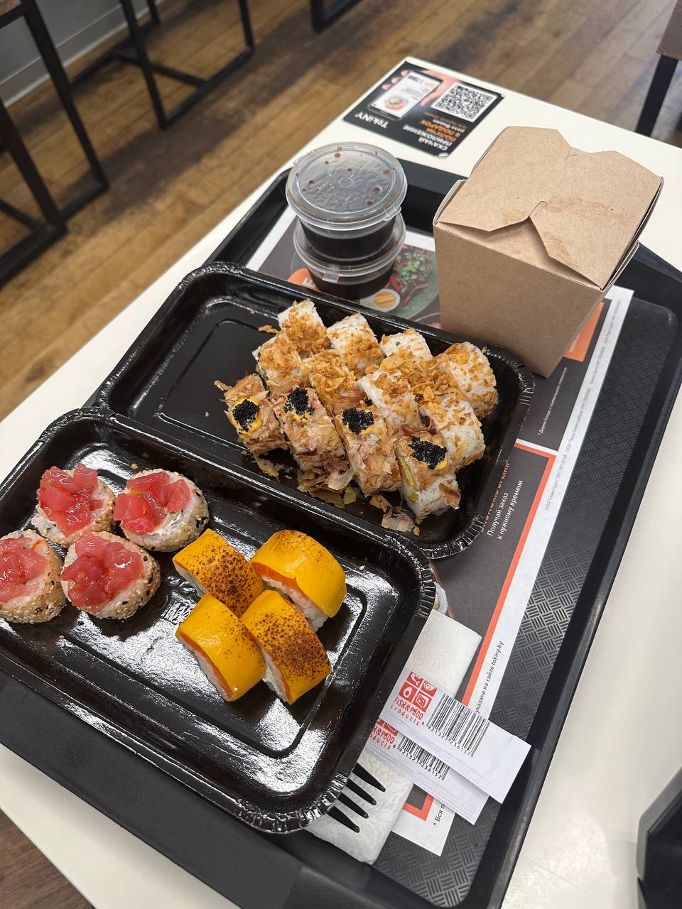 - "Пабло Фрай" (острое): креветка, сливочный сыр, огурец, имбирь маринованный, соус ореховый, панировка - 10 шт.