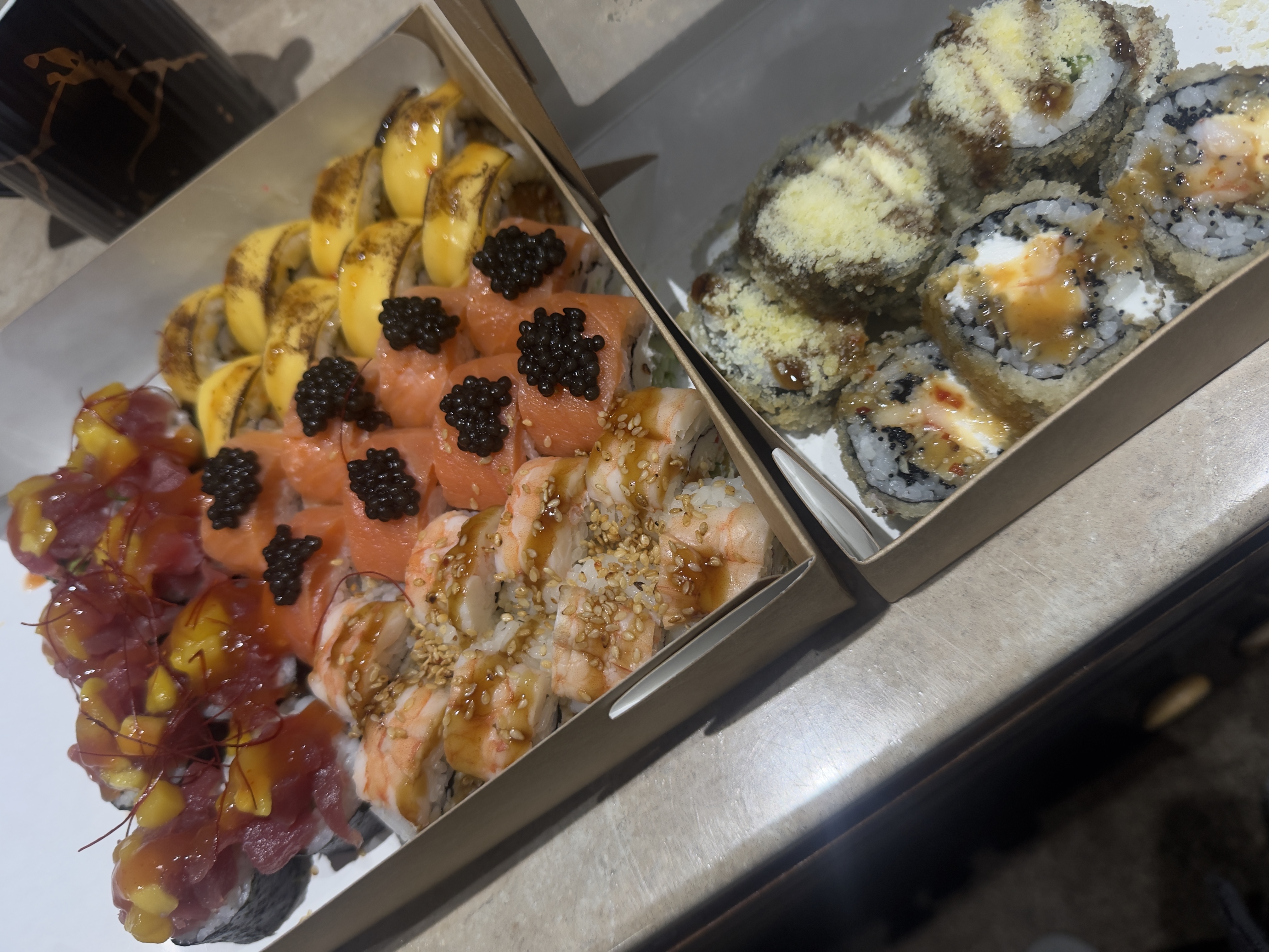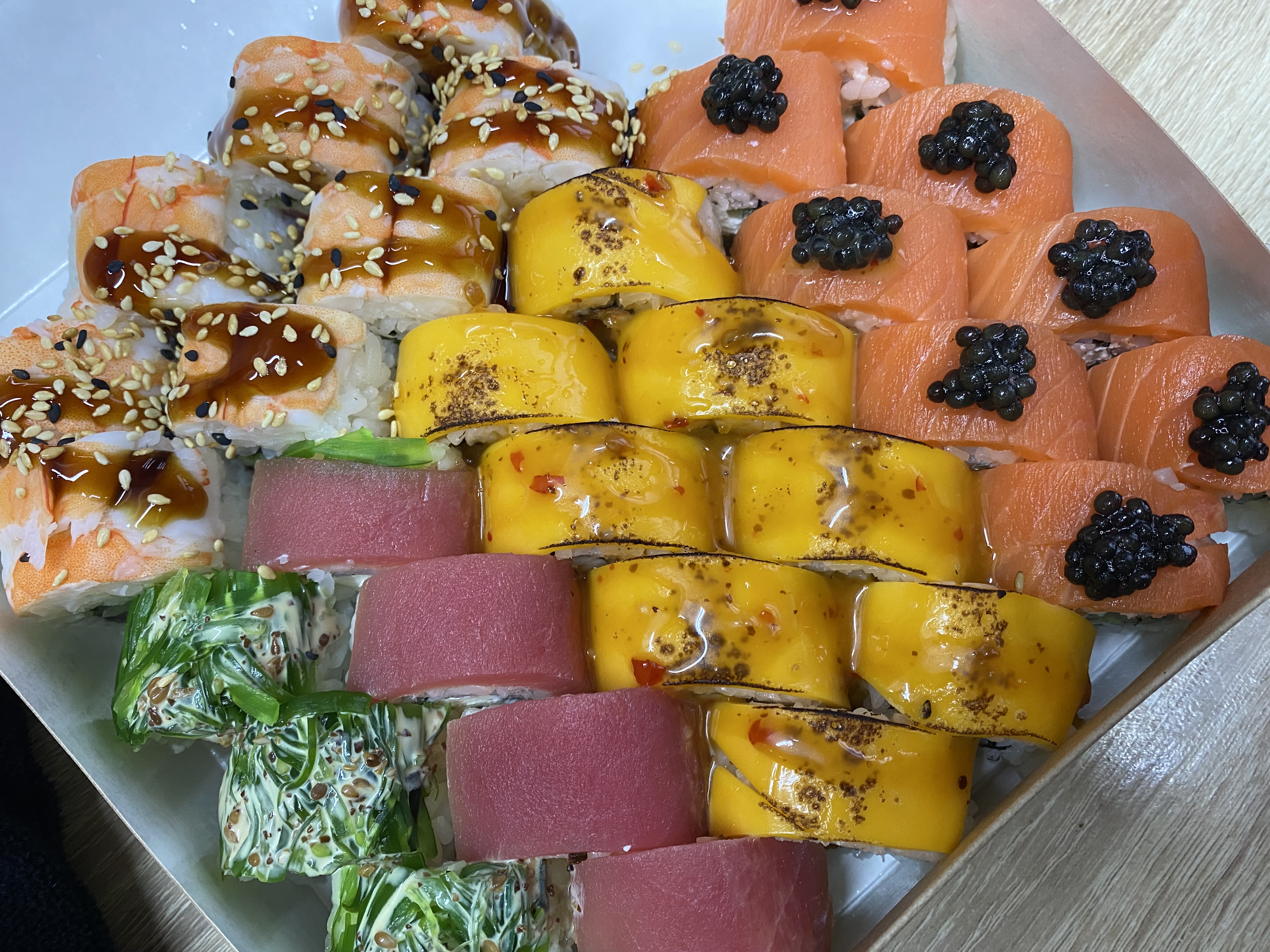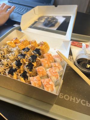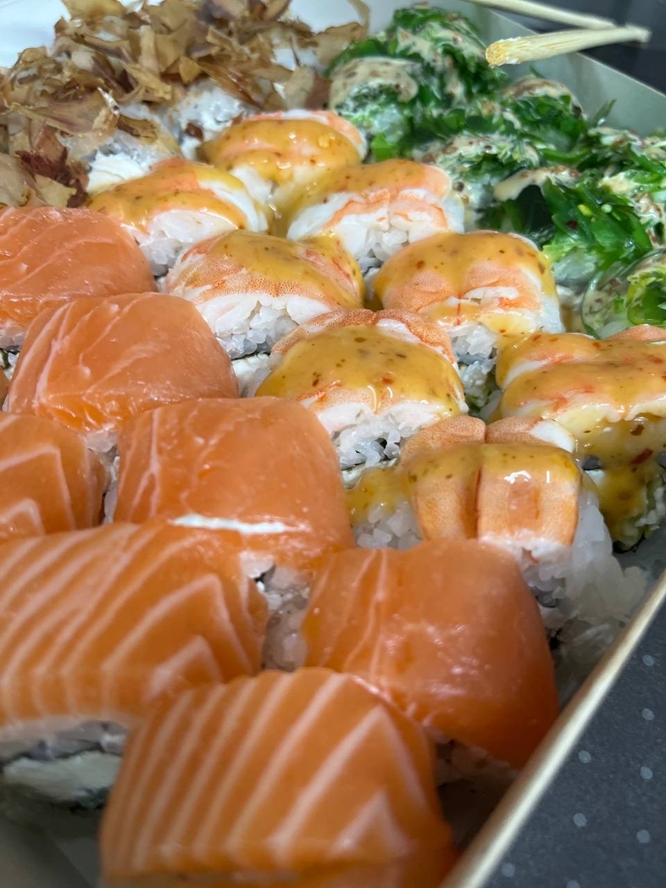 - "Бостон": креветка, сливочный сыр, ананас, салат Айсберг, соус сладко-ореховый, икра Тобико красная. Острое - 8 шт.