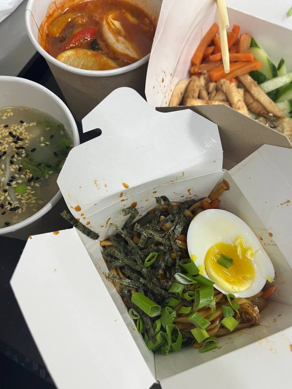 - тяхан со свининой чашу в соусе терияки (размер "М"): японский рис, обжаренный в кунжутном масле с яйцом, соус терияки, свинина чашу, морковь, кунжут, репчатый рук, лук перо зеленый- удон с цыпленком в кисло-сладком соусе (размер "М"): пшеничная лапша в кисло-сладком соусе, цыпленок, пекинская капуста, морковь, спаржевая фасоль, ананас, яйцо, лук перо зеленый, нори