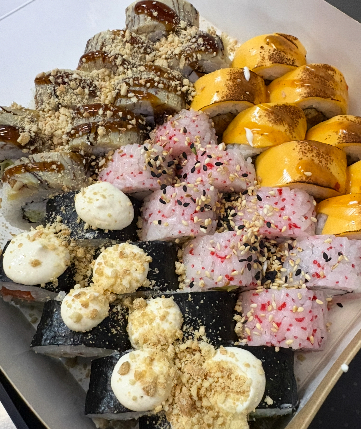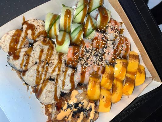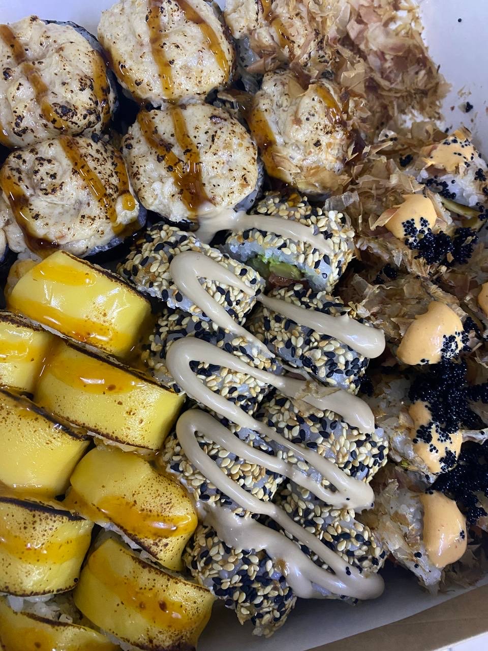 - "Детройт": цыпленок-гриль, томат, салат Айсберг, такуан, сливочный сыр, луковый мармелад, соус Лос-Анджелес и орехи кешью - 8 шт.