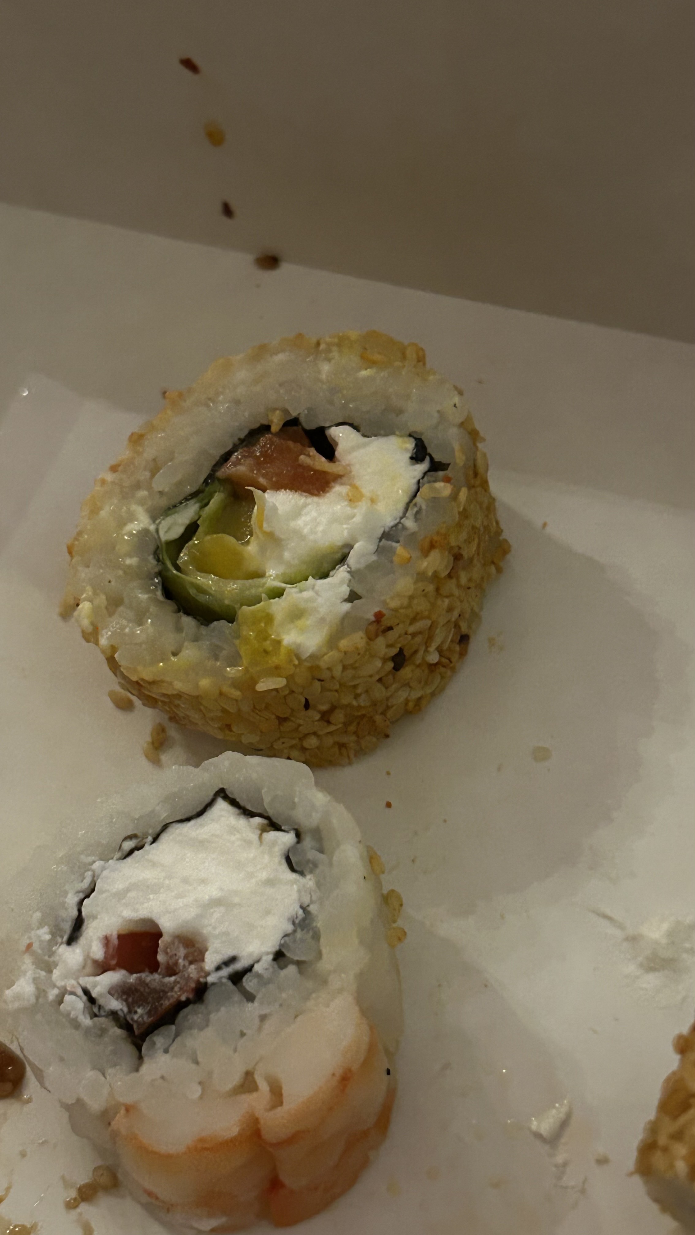 - "Пабло Фрай": креветка, сливочный сыр, огурец, имбирь маринованный, соус ореховый, панировка. Острое - 5 шт.