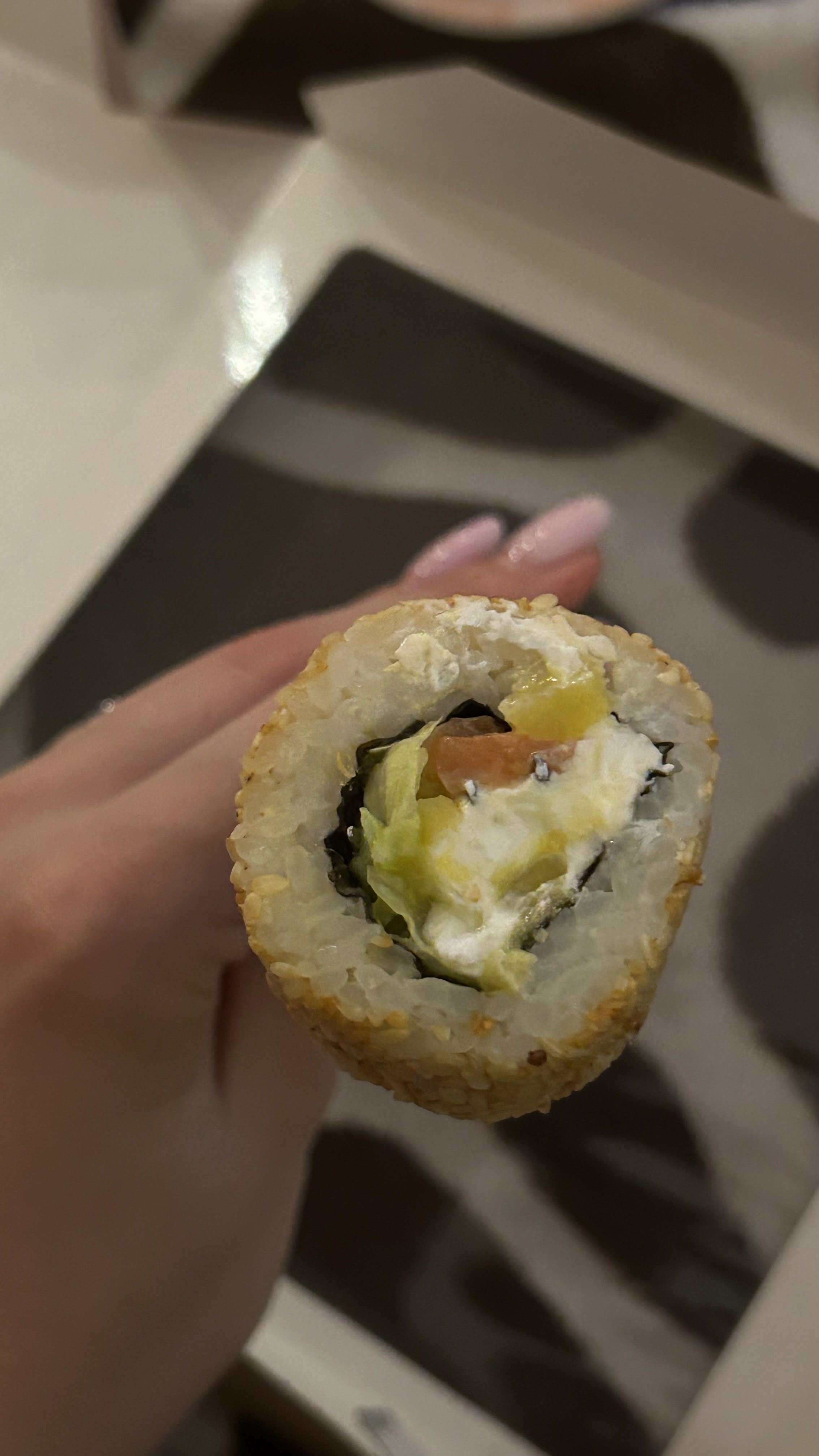 - "Аризона фрай": филе лосося, сливочный сыр, огурец, такуан, панировка - 5 шт.