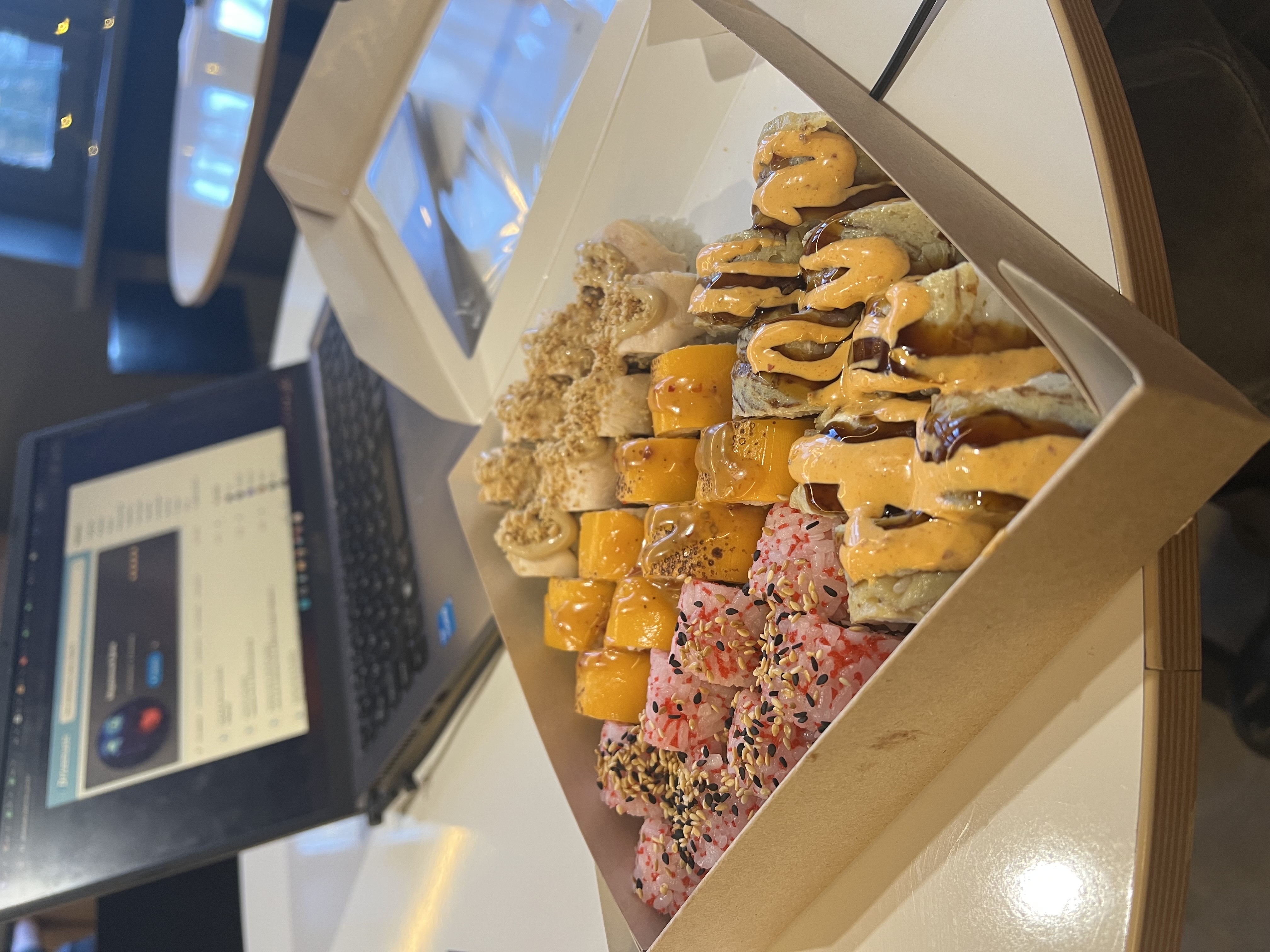 - "Дентон": бекон, овощи-гриль, сливочный сыр, омлет тамаго, соус терияки и соус спайси - 8 шт.