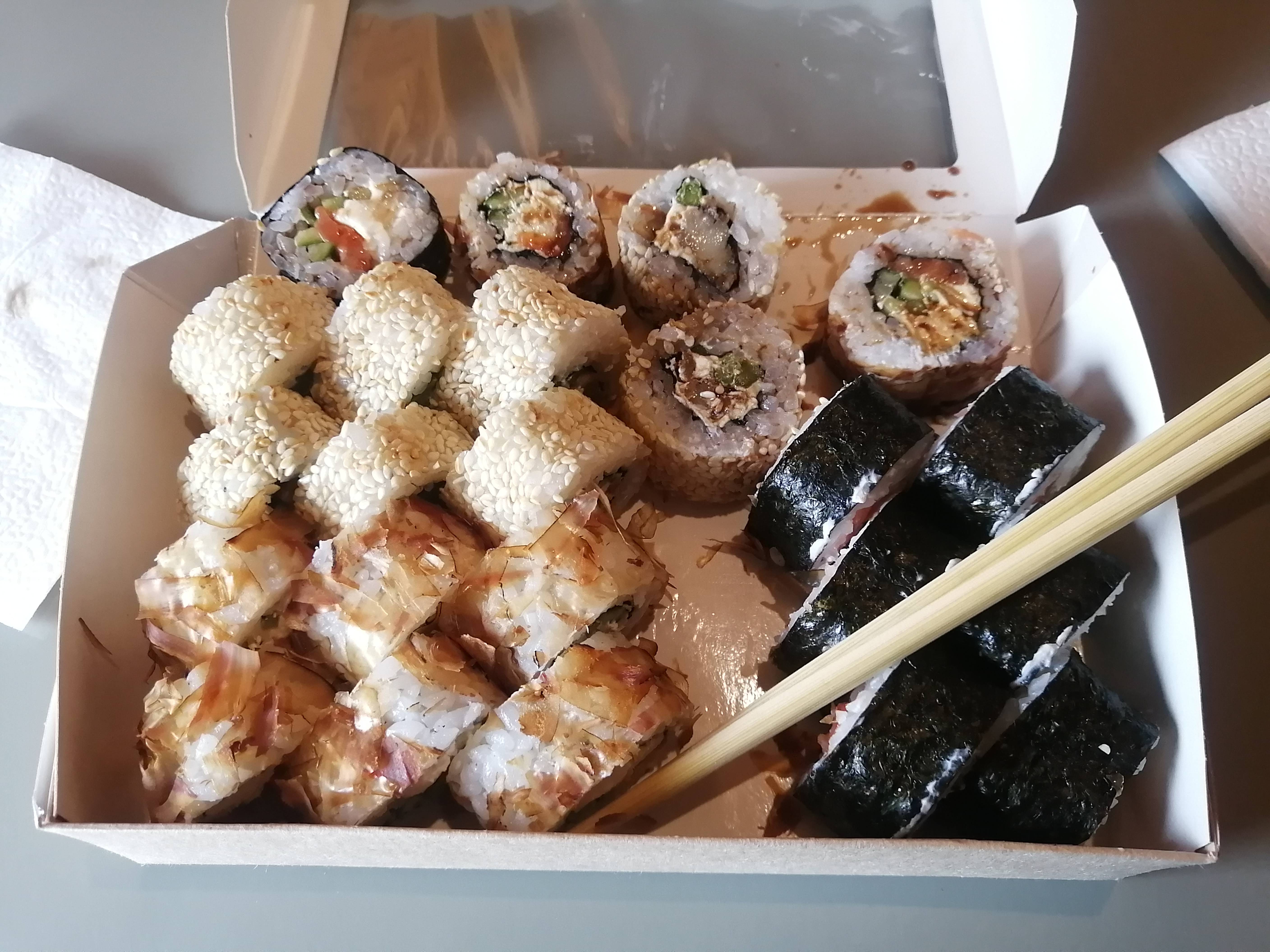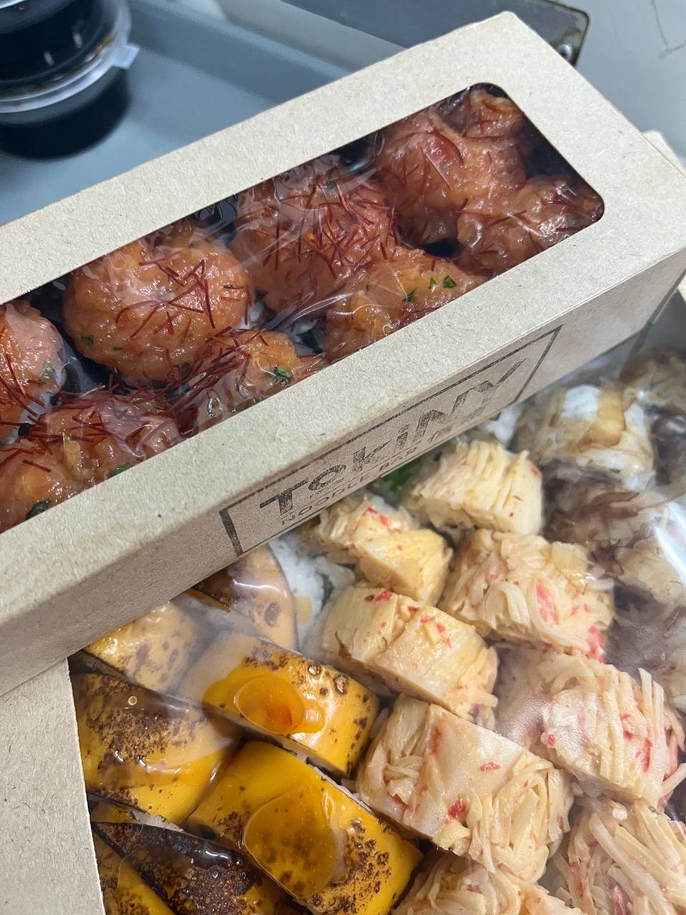 - "Хотсити": жареный морской окунь, сливочный сыр, огурец, омлет тамаго, сырный соус, нори, соус терияки - 8 шт.