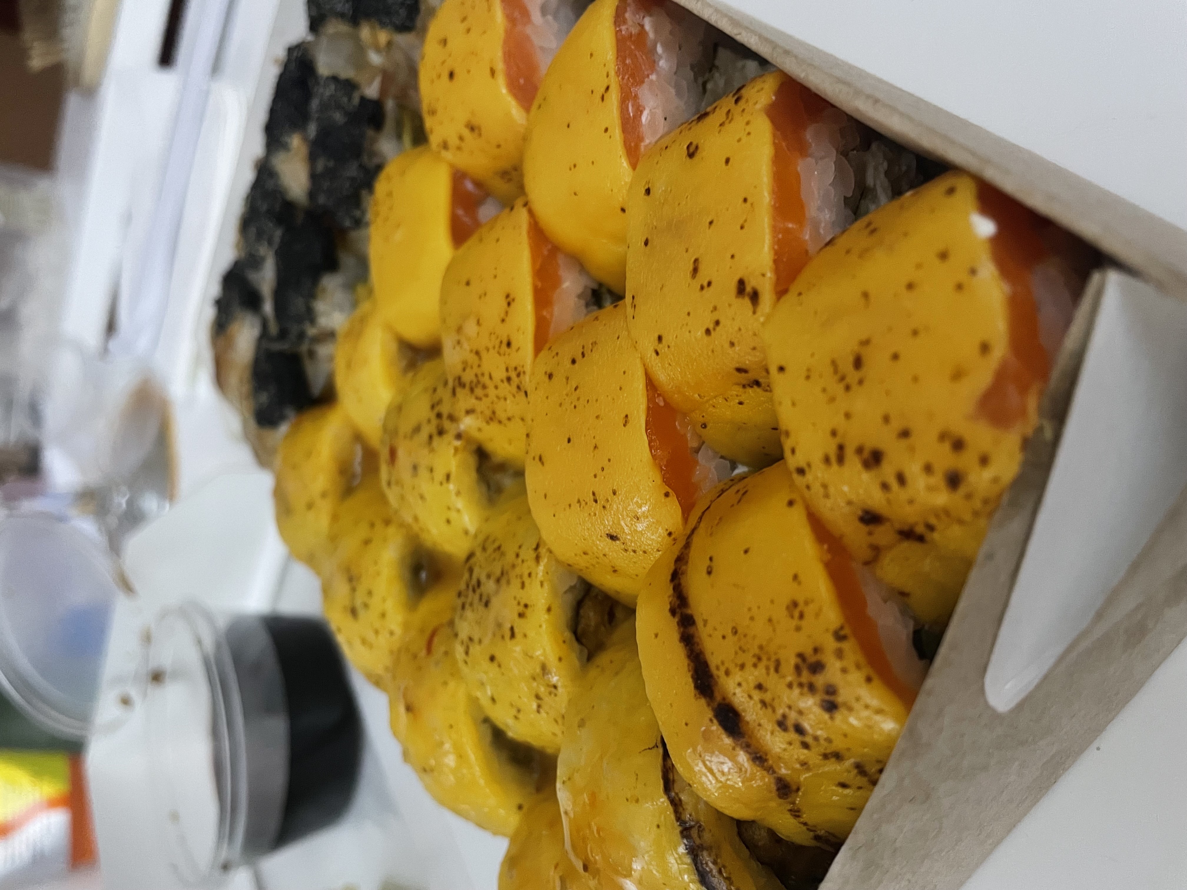- ролл "Колорадо": жареный лосось в соусе терияки, сыр чеддер, соус сырный, криспи - 8 шт.