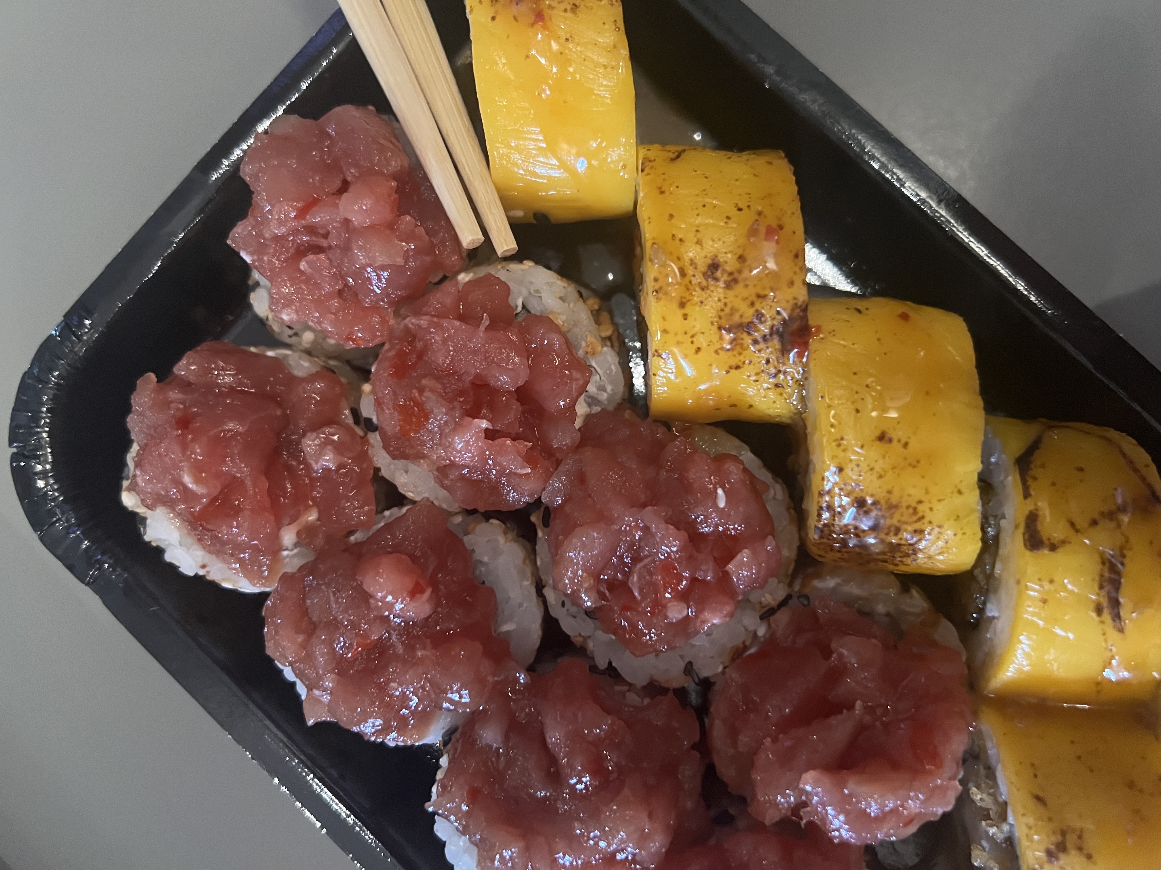 - "Бруклин с тунцом": филе тунца, сливочный сыр, омлет тамаго, томат, стружка тунца - 8 шт.