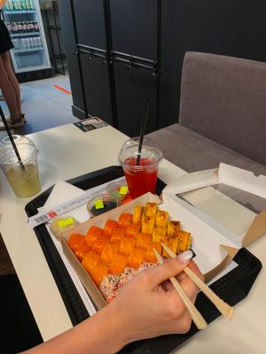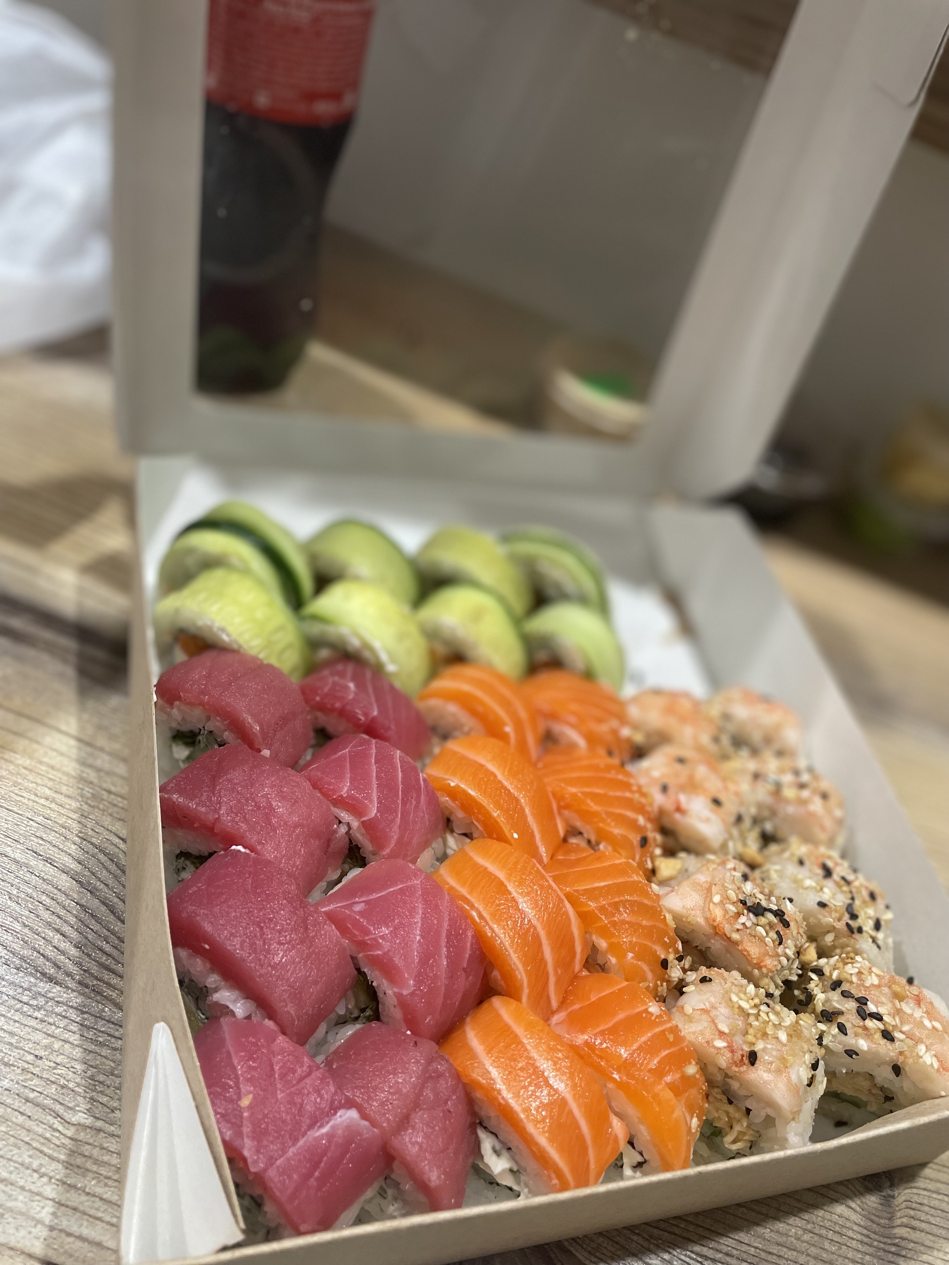 - "Манхеттен": филе лосося, сливочный сыр, авокадо, огурец, кунжут - 8 шт.
