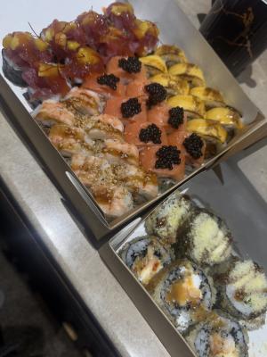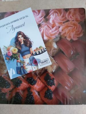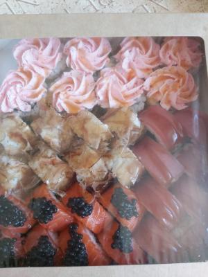 - "Брайтон": филе тунца, сливочный сыр, такуан, огурец, лук зеленый, соус пряный, соус терияки, орехи кешью - 8 шт.