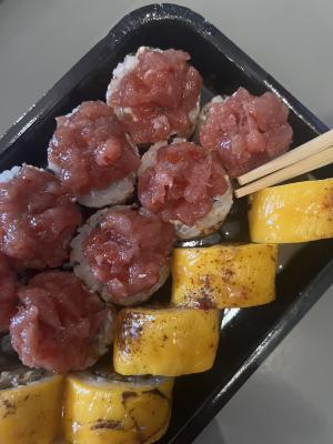 - "Нидзи тунец": филе тунца, сливочный сыр, огурец, такуан, рукола, соус Терияки - 8 шт.