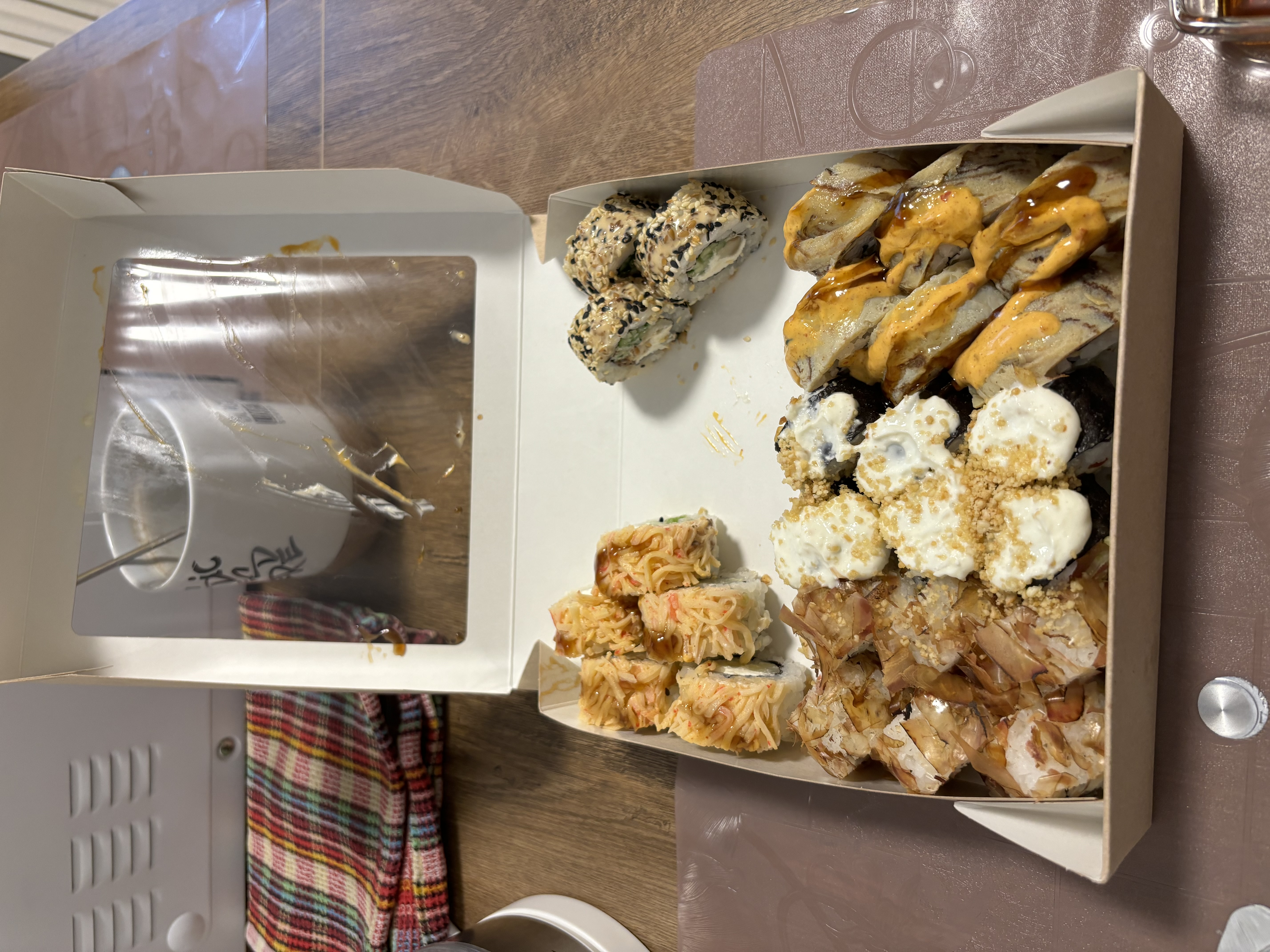 - "Детройт": цыпленок-гриль, томат, салат Айсберг, такуан, сливочный сыр, луковый мармелад, соус Лос-Анджелес и орехи кешью - 8 шт.
