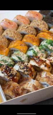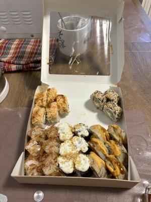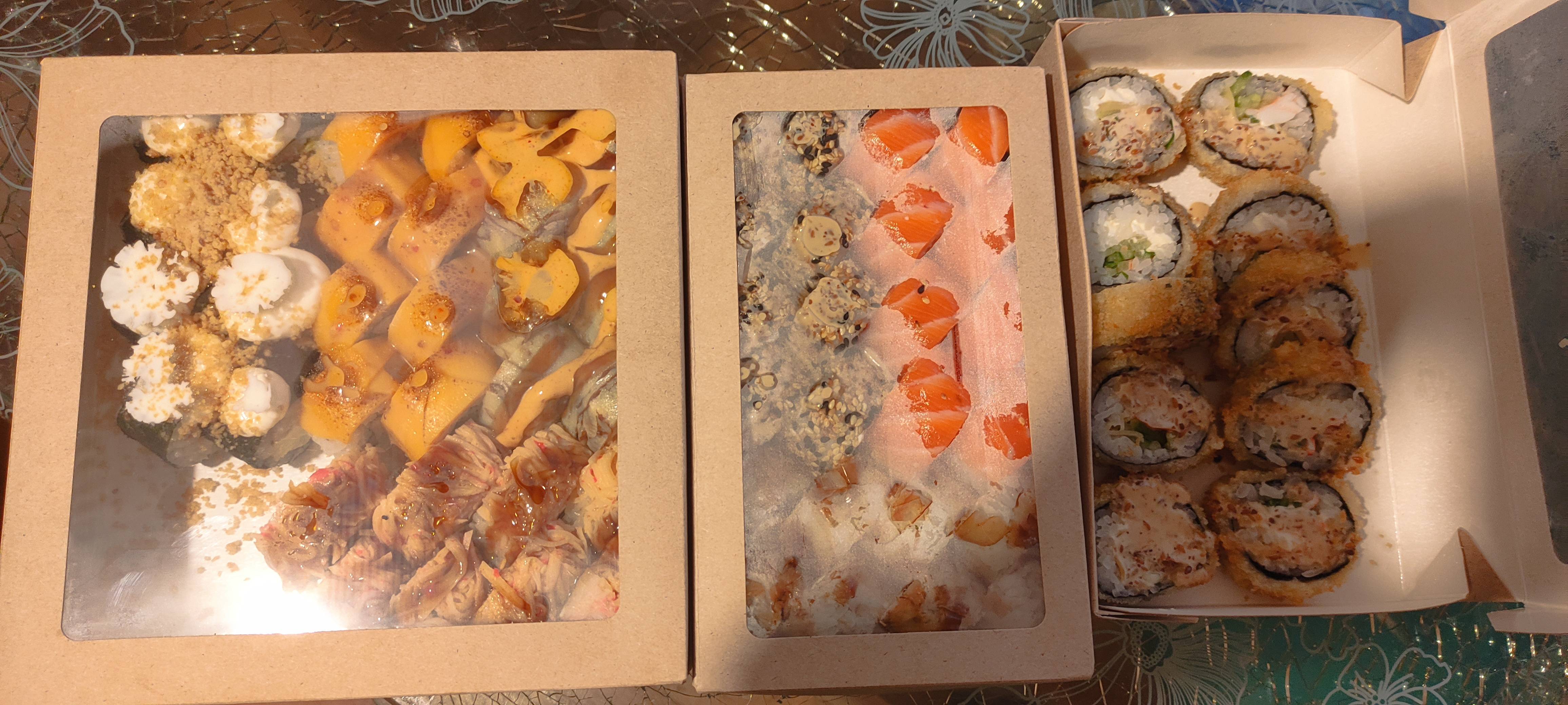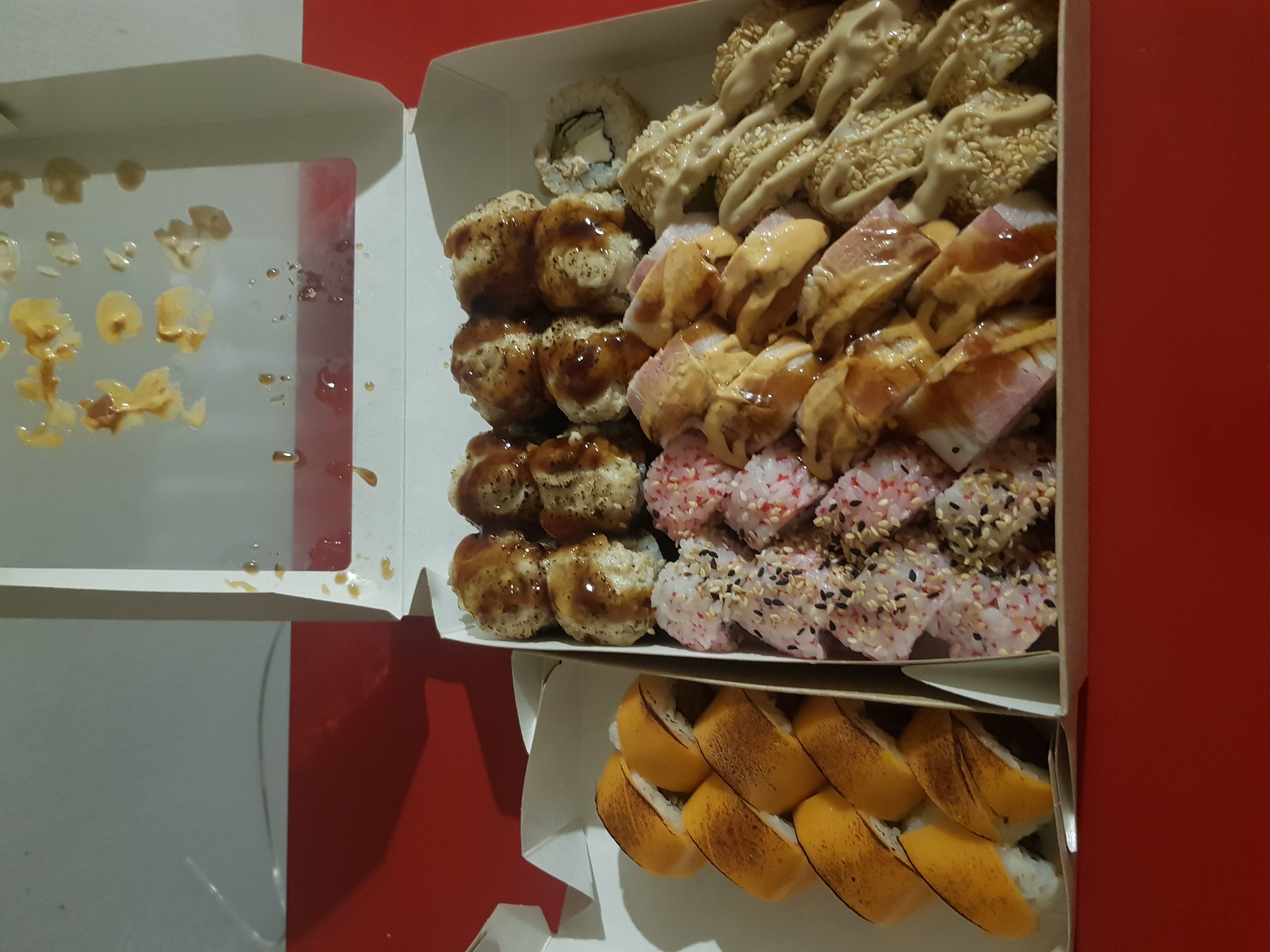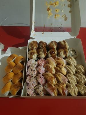 - "Бостон": креветка, сливочный сыр, ананас, салат Айсберг, соус сладко-ореховый, икра Тобико красная. Острое - 8 шт.