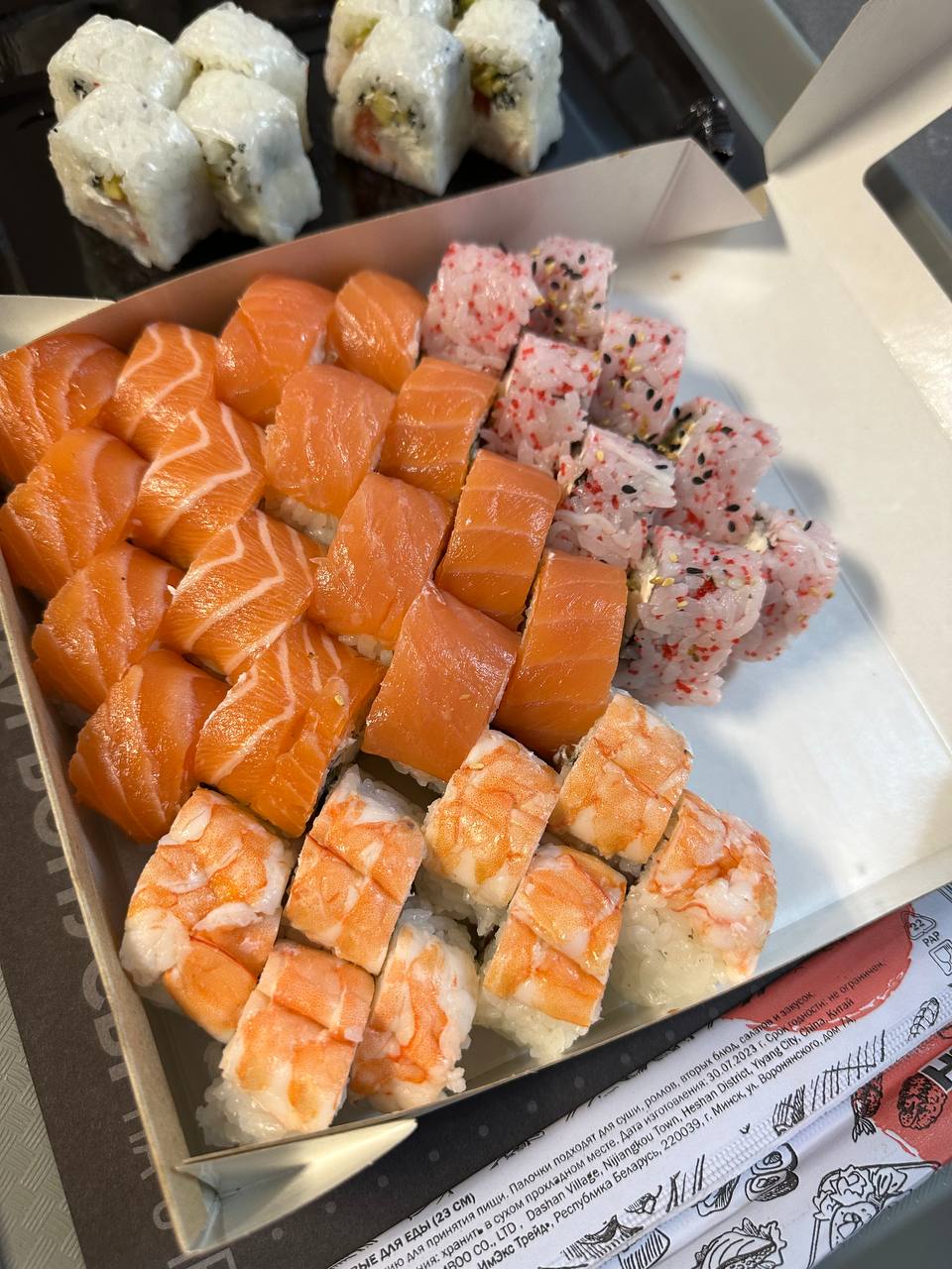 - "Чарлстон": филе лосося, сливочный сыр, филе тунца, лук жареный, огурец - 8 шт.