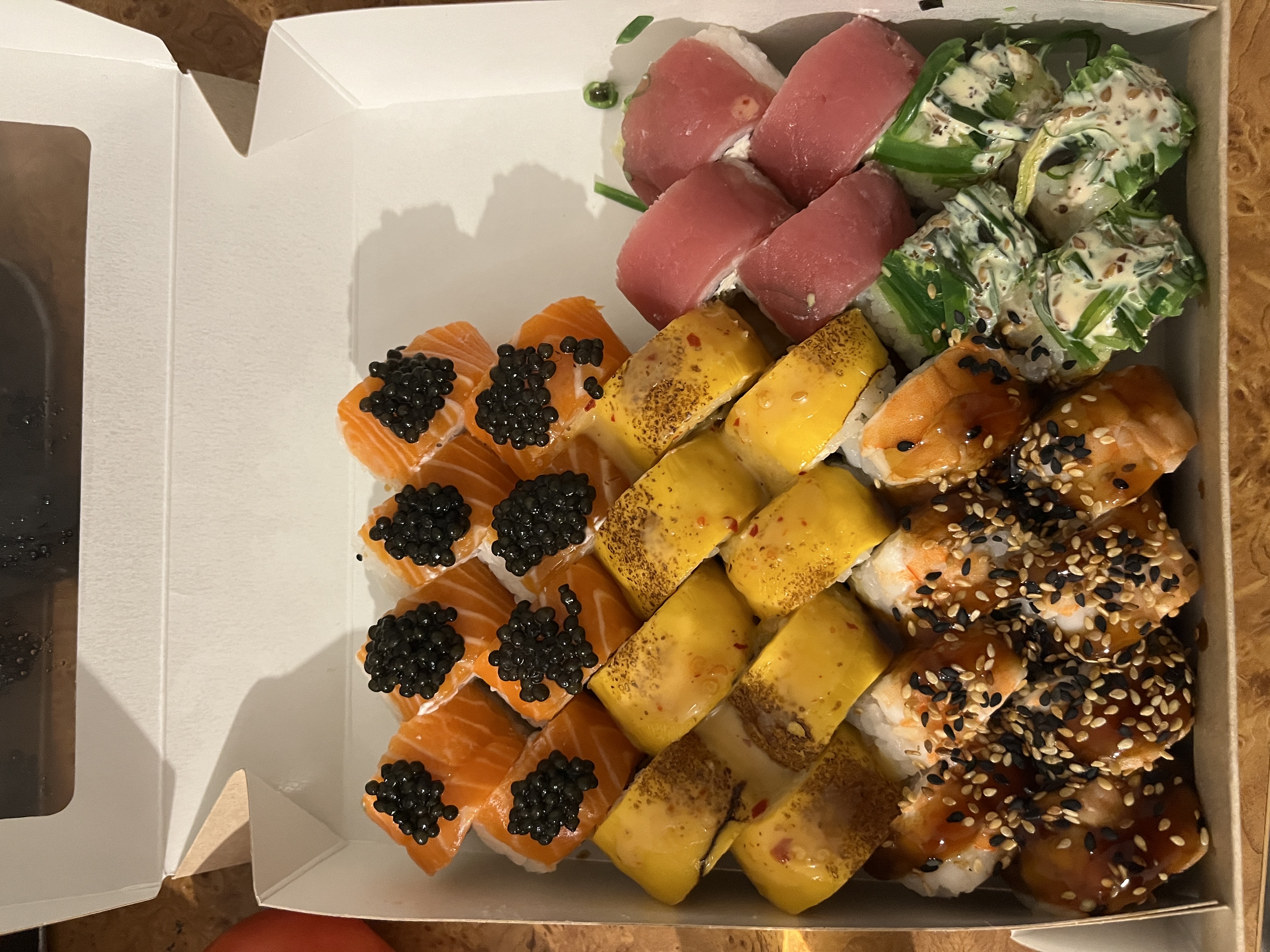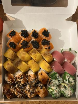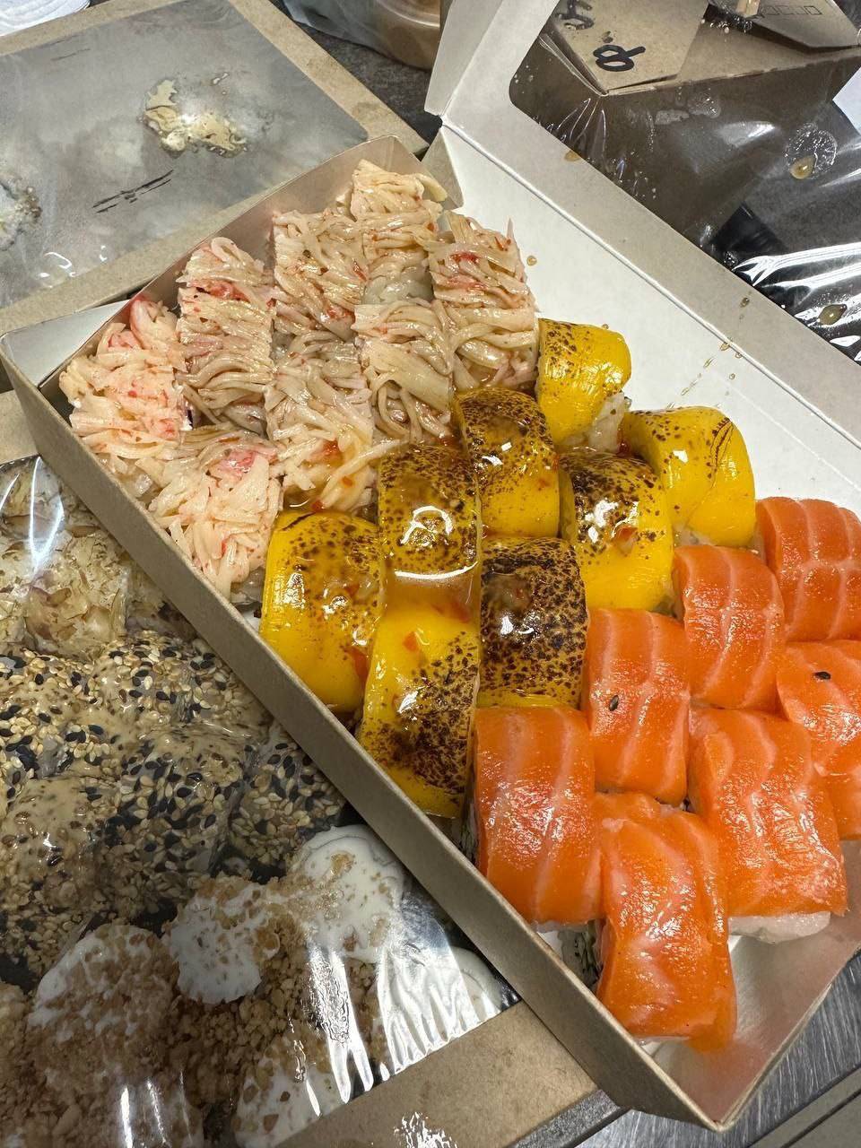 - "Манчестер": жареное филе лосося, такуан, сливочный сыр, омлет тамаго, соус лос-анджелес, кунжут - 8 шт.