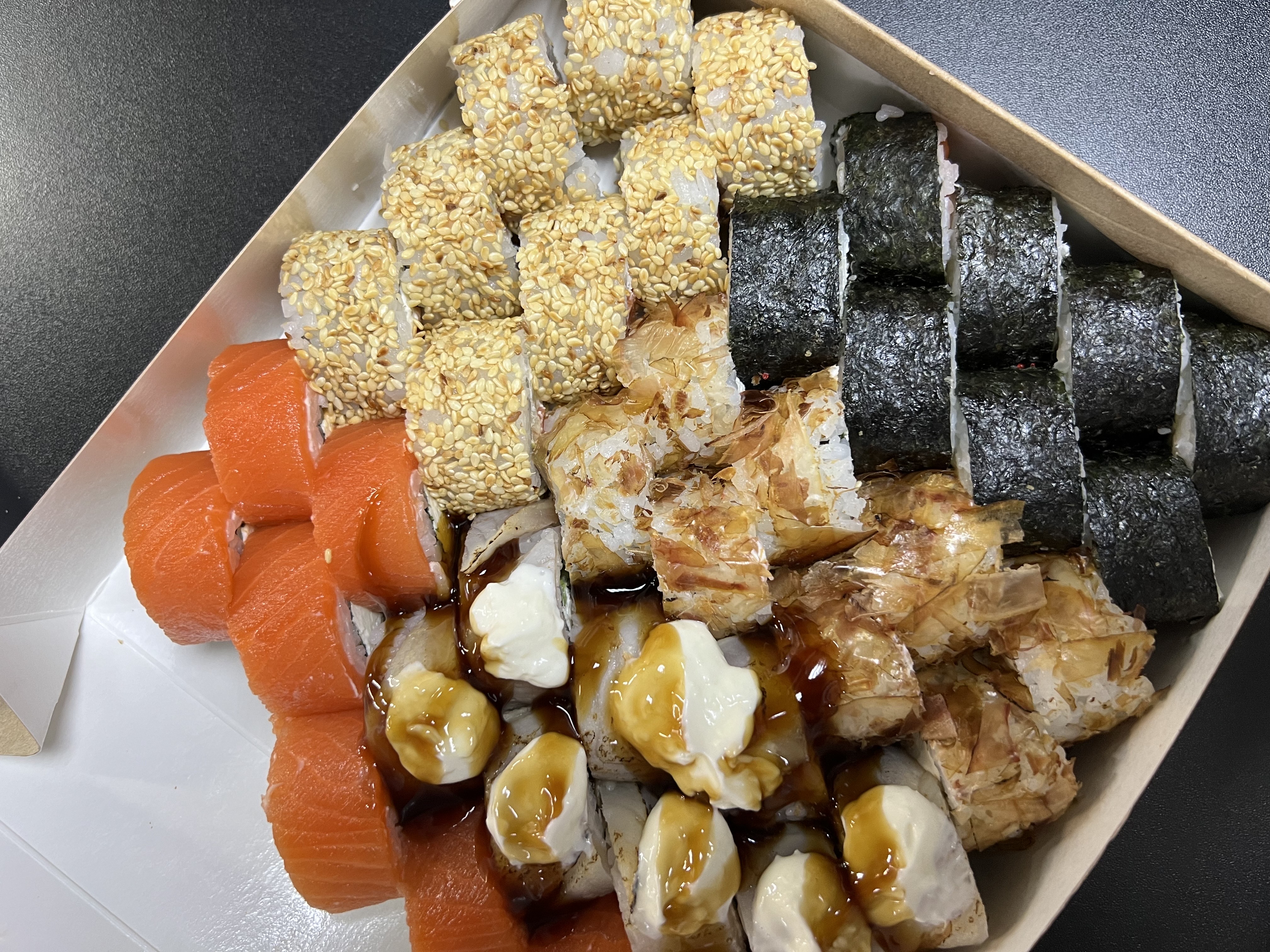 - "Манхеттен": филе лосося, сливочный сыр, авокадо, огурец, кунжут - 8 шт.