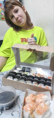 - "Ролл с жаренным окунем": жареный окунь, сливочный сыр, огурец - 8 шт.