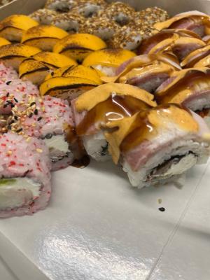 - "Ролл с лососем и манго в кунжуте": филе лосося, сливочный сыр, салат айсберг, манго, кунжут, кешью - 8 шт.