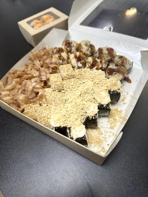 - "Инаги": жареный морской окунь, сливочный сыр, огурец, омлет тамаго, сырный соус, соус терияки, соус пряный - 8 шт.